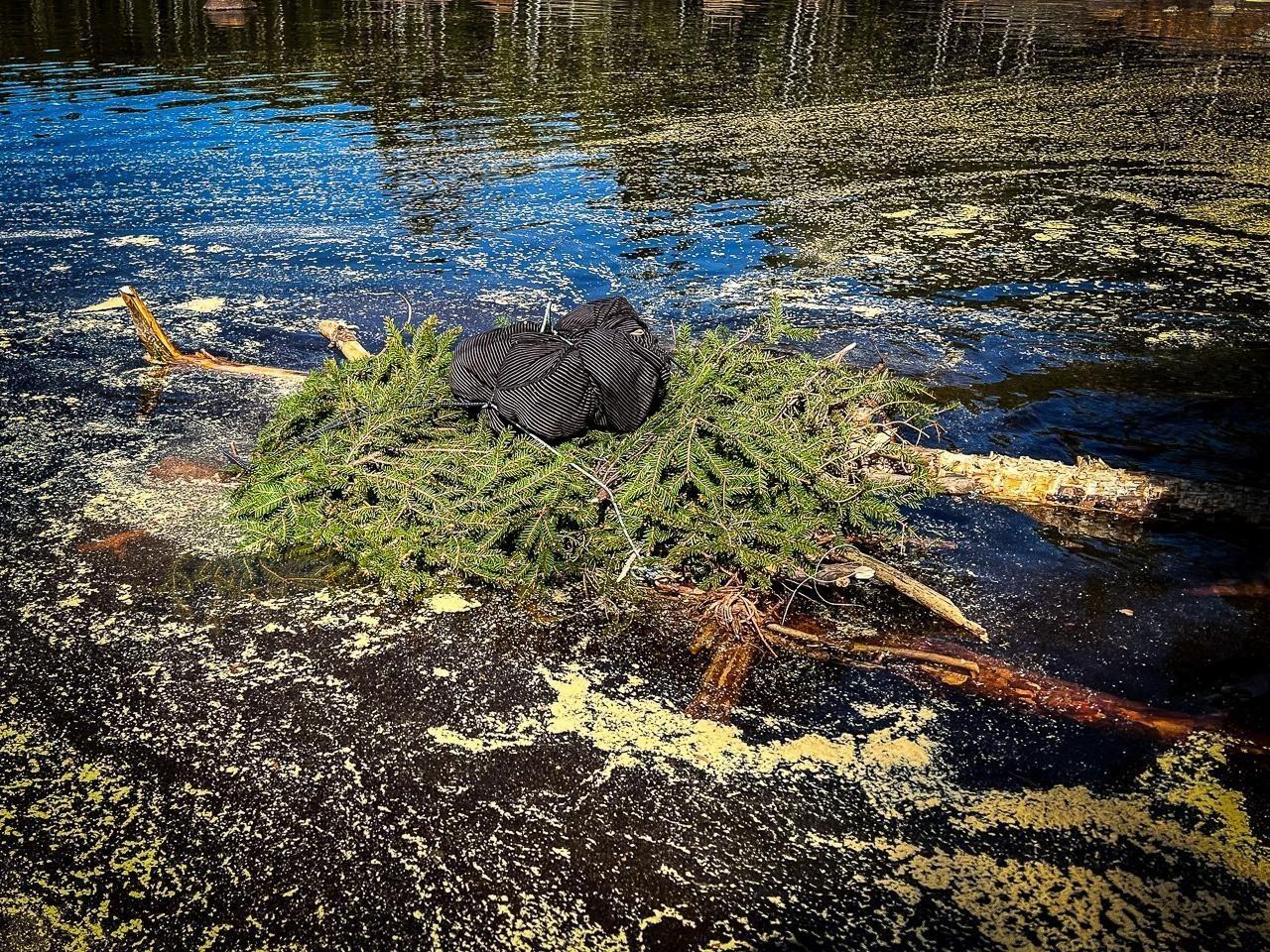 Schwimmende Holzstruktur mit Nadelzweigen und schwarzem Gegenstand auf Wasseroberfläche