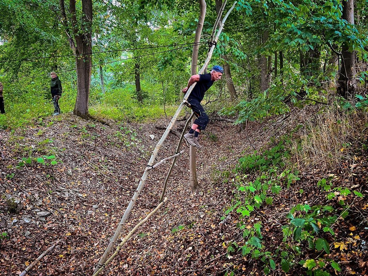 Selbstgebaute Seilbrücke wird zur Überquerung eines Grabens genutzt