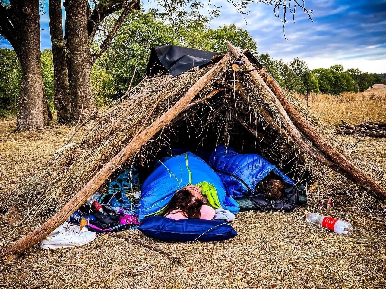 Tarp-Notunterkunft aus Ästen und Gras mit Schlafsäcken im Inneren