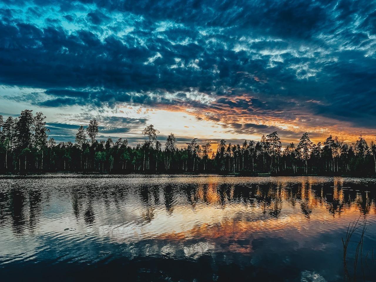 Wasseroberfläche spiegelt bewölkten Himmel und Bäume am Ufer