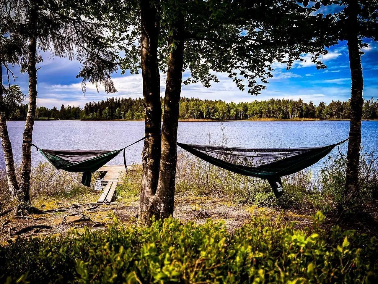Zwei Hängematten hängen zwischen Bäumen am Ufer eines Sees