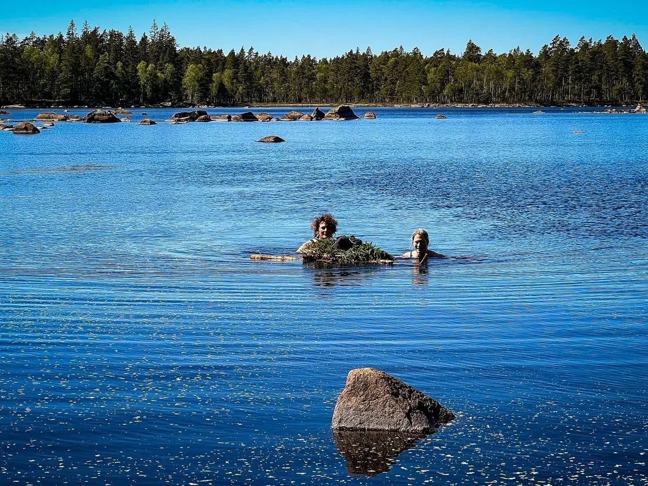 Zwei Personen schwimmen im klaren Wasser eines Sees, umgeben von Felsen und Bäumen