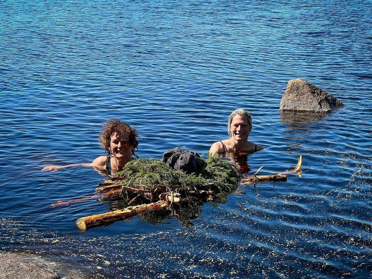 Zwei Personen schwimmen im Wasser neben einer schwimmenden Holz- und Pflanzenkonstruktion