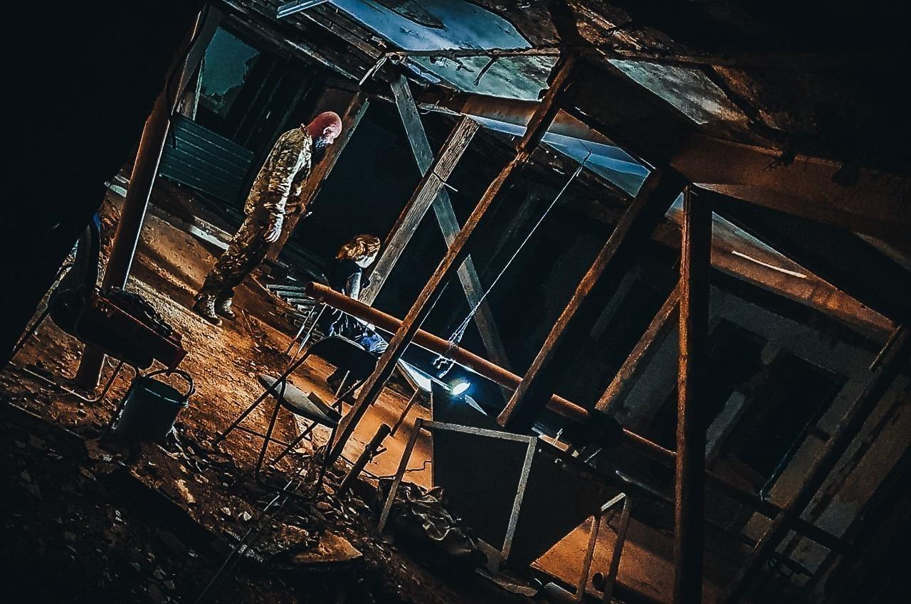Zwei Personen stehen in einem verlassenen, dunklen Raum mit beschädigter Decke