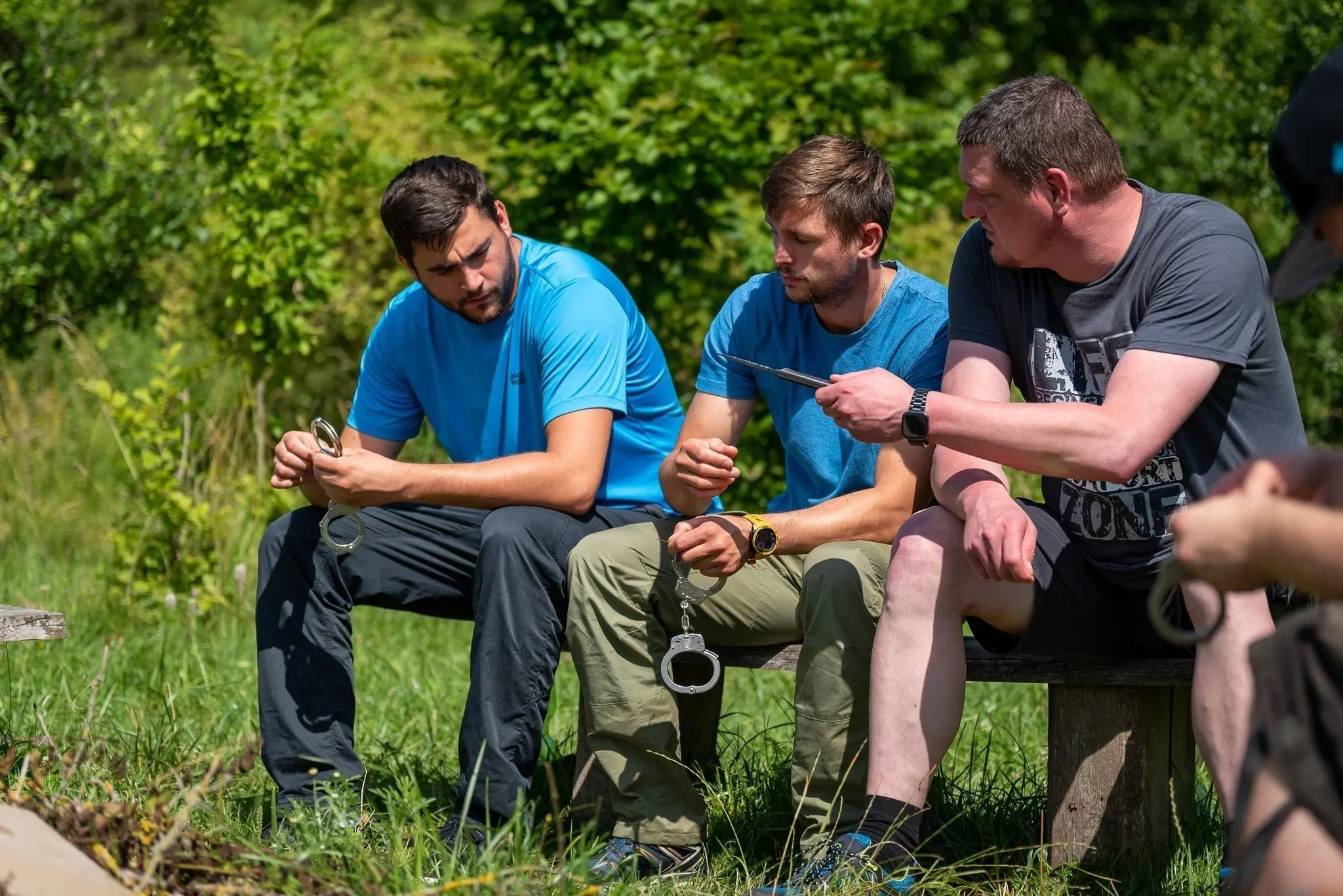 Drei Personen sitzen auf einer Bank und diskutieren über eine Handfessel