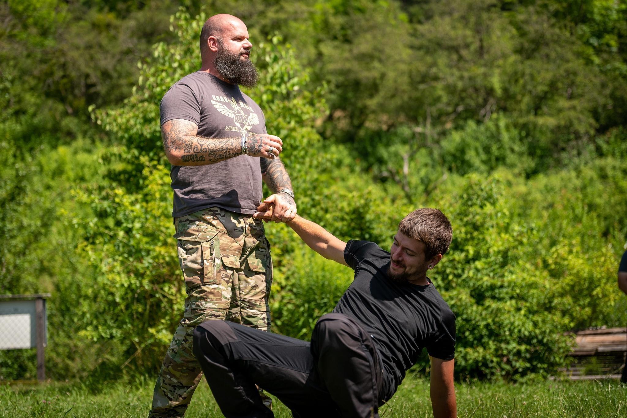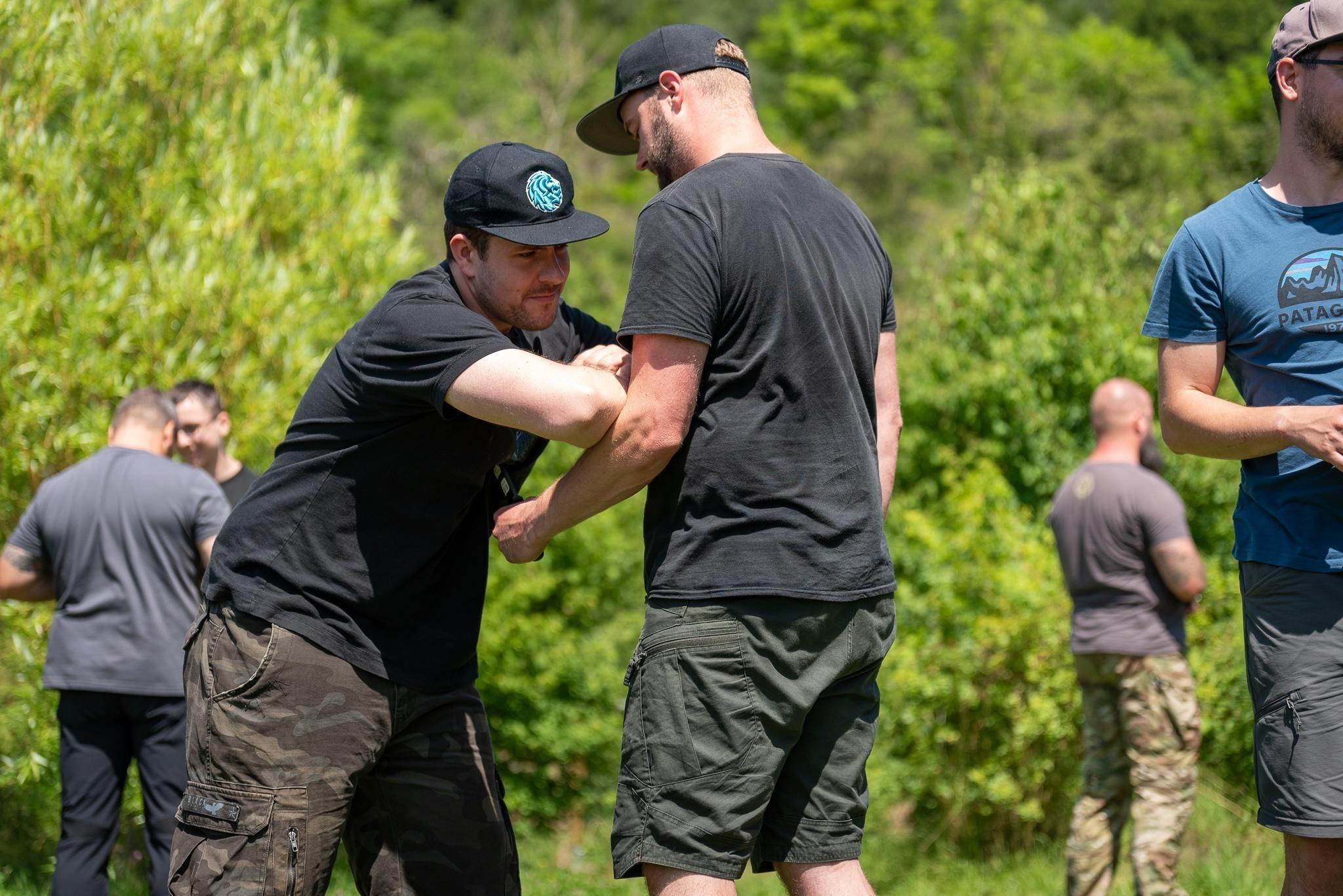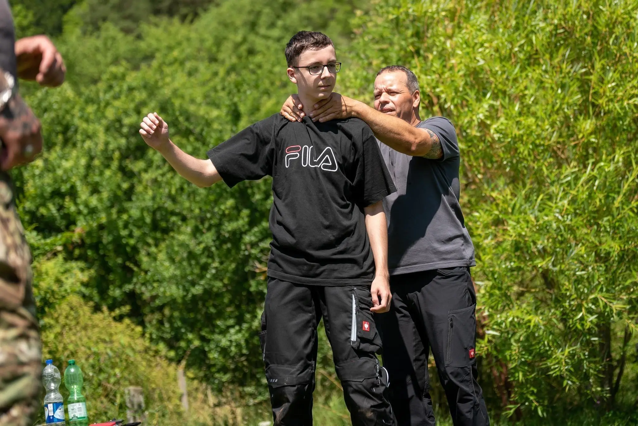 Zwei Personen üben eine Nahkampftechnik im Freien unter Bäumen