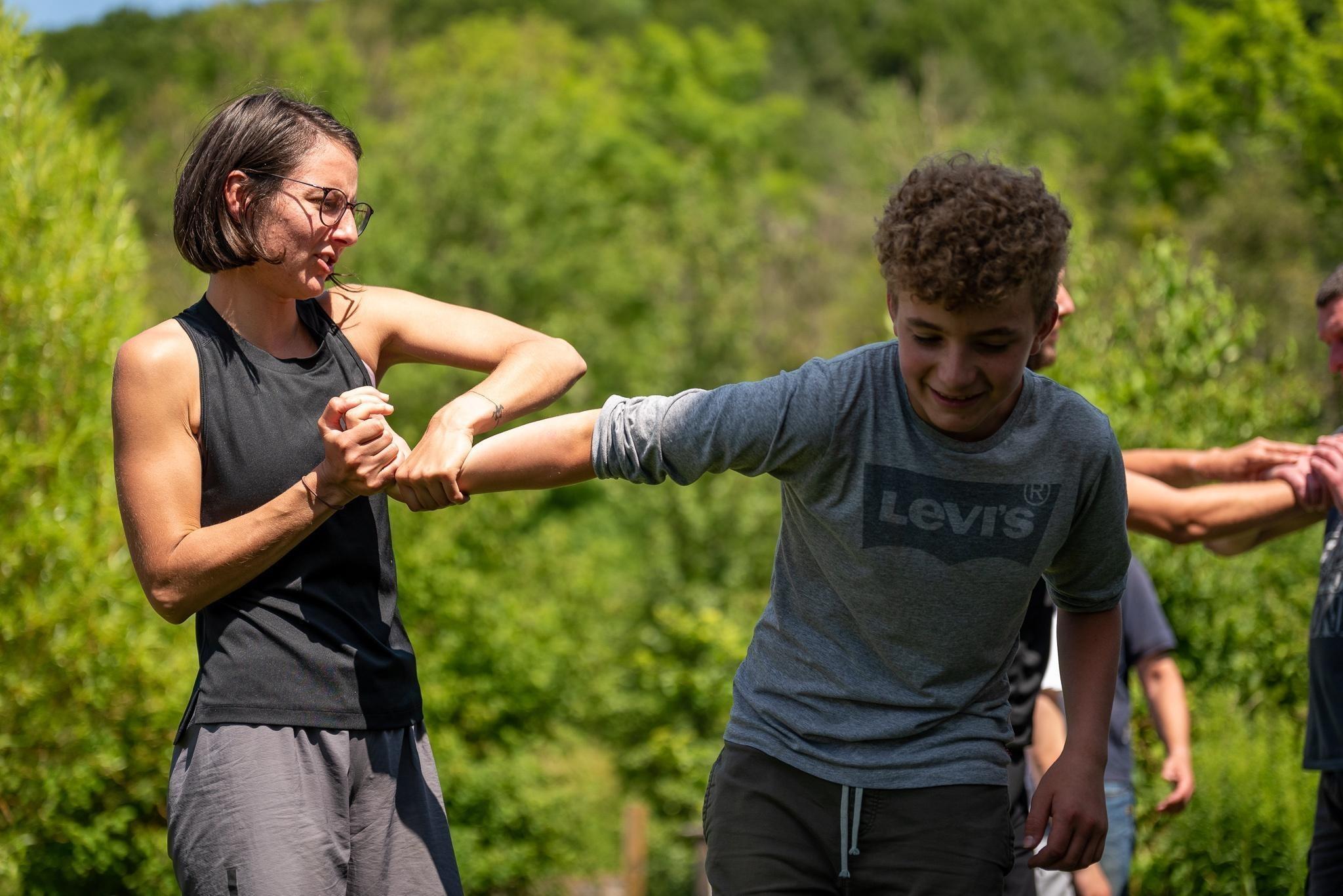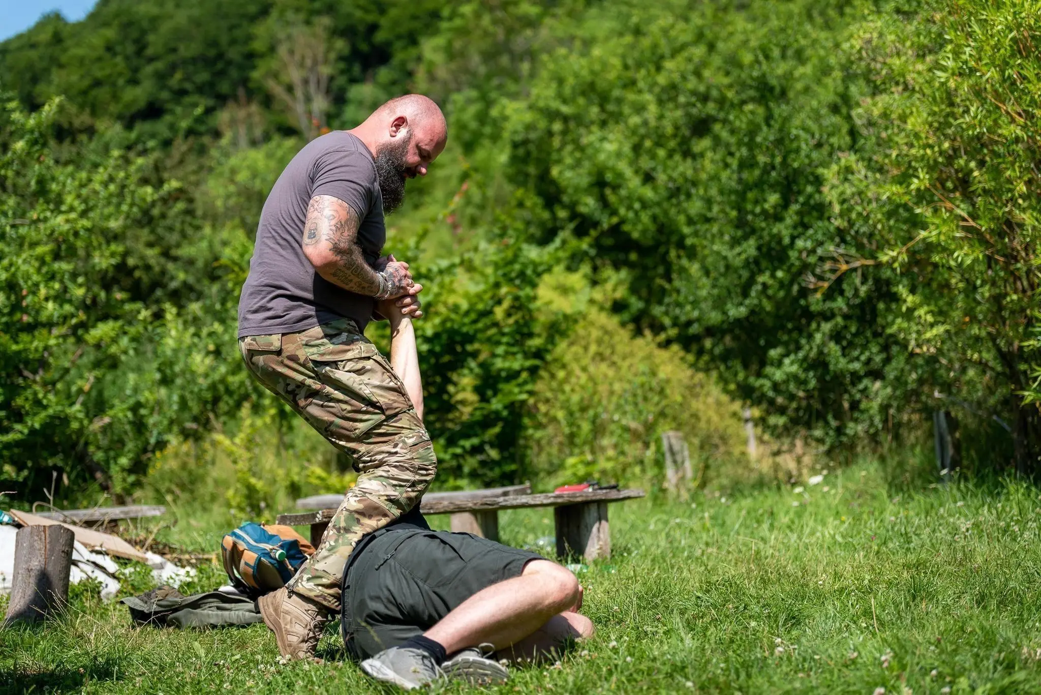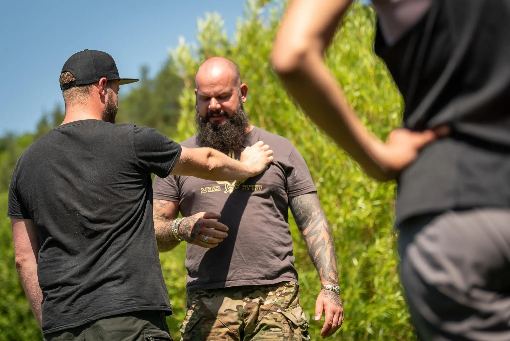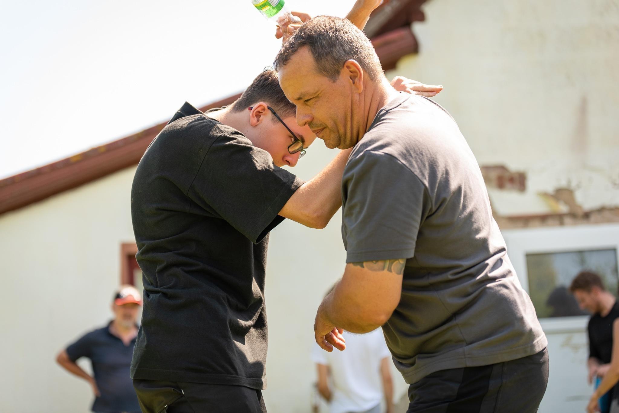 Zwei Personen üben eine Nahkampftechnik im Freien unter Bäumen