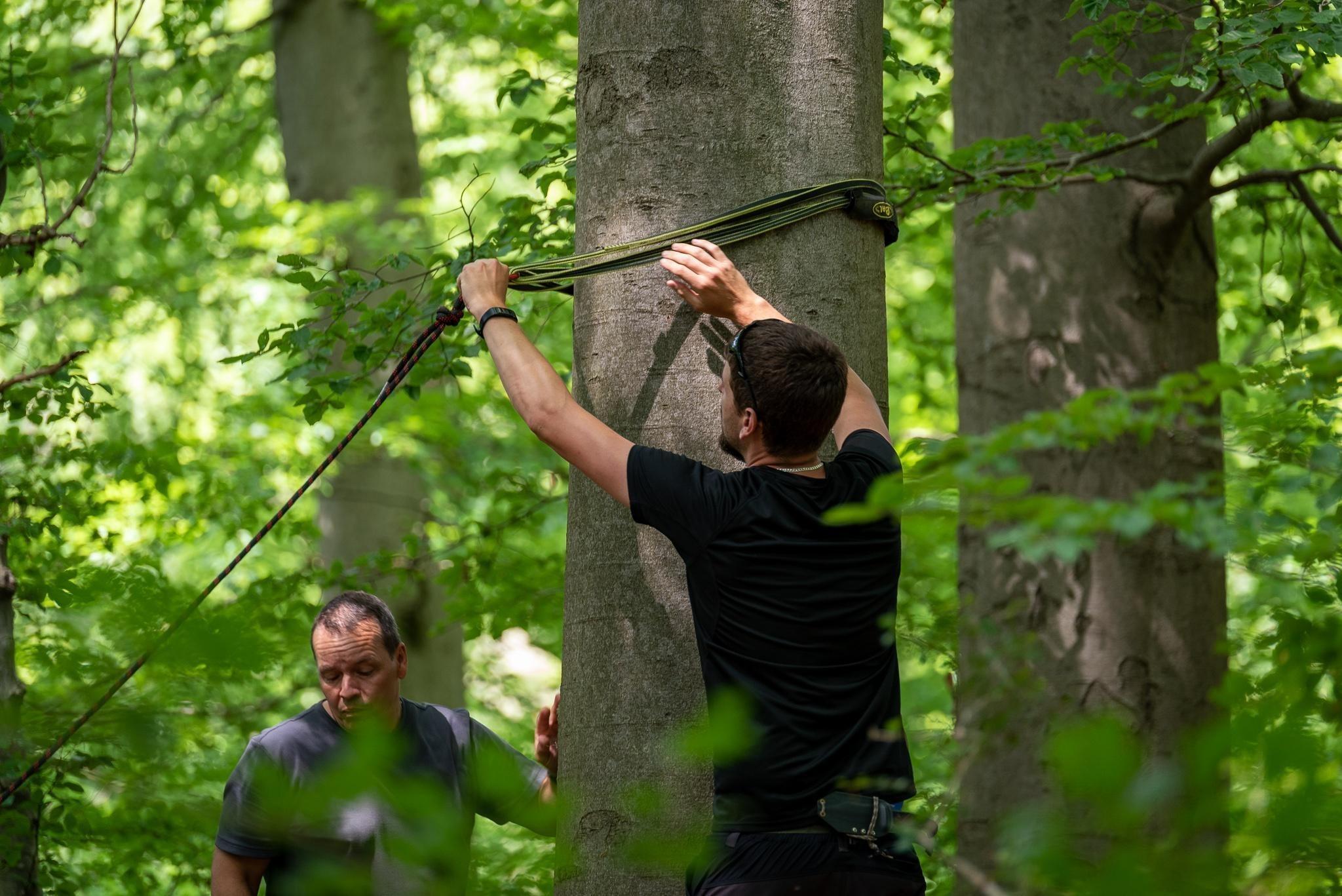 Seil wird um einen Baumstamm gewickelt, während eine Person beobachtet