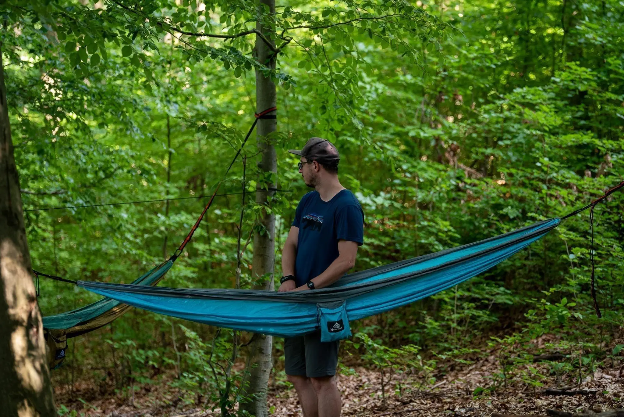 Hängematte zwischen Bäumen gespannt, Person steht daneben und schaut nachdenklich