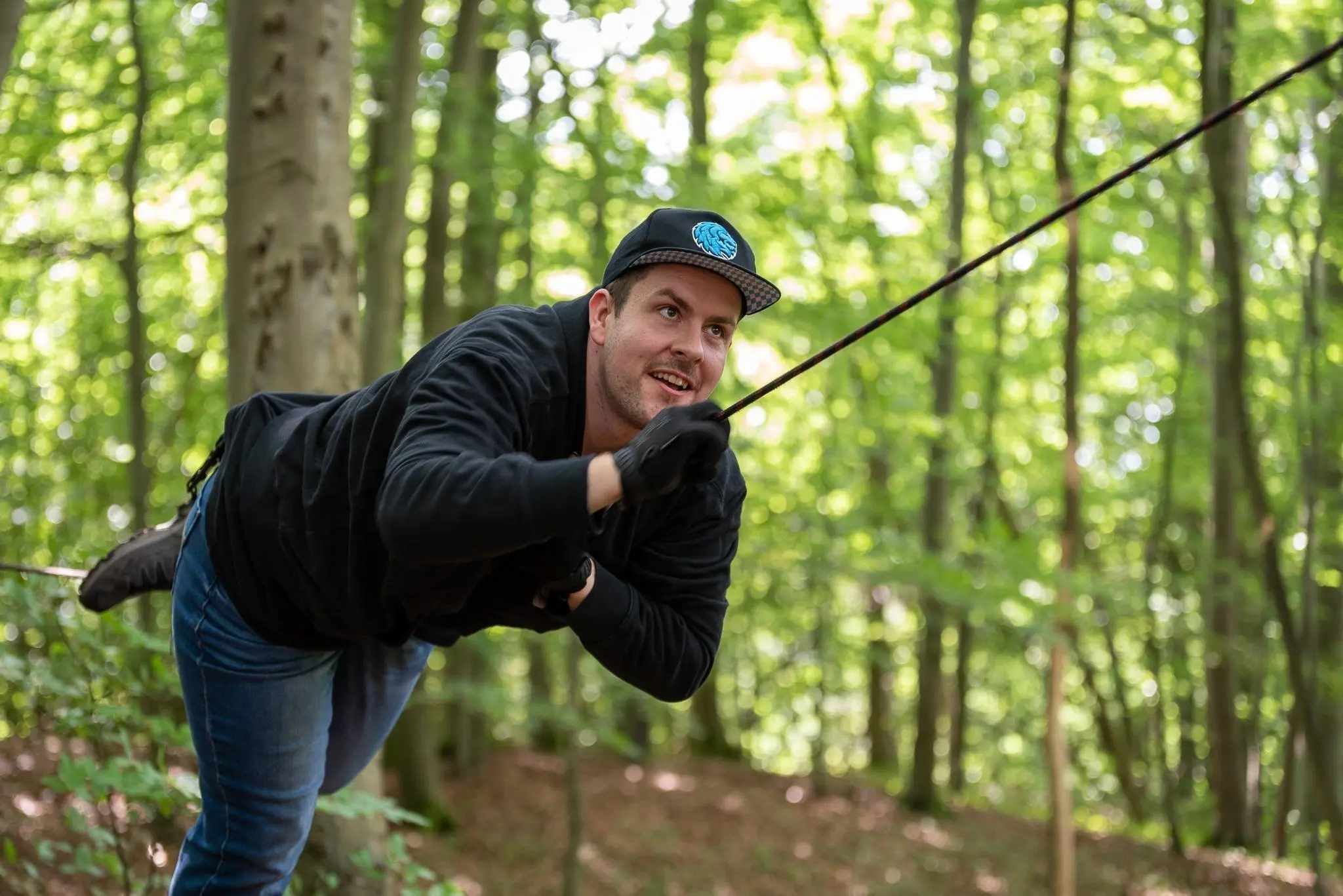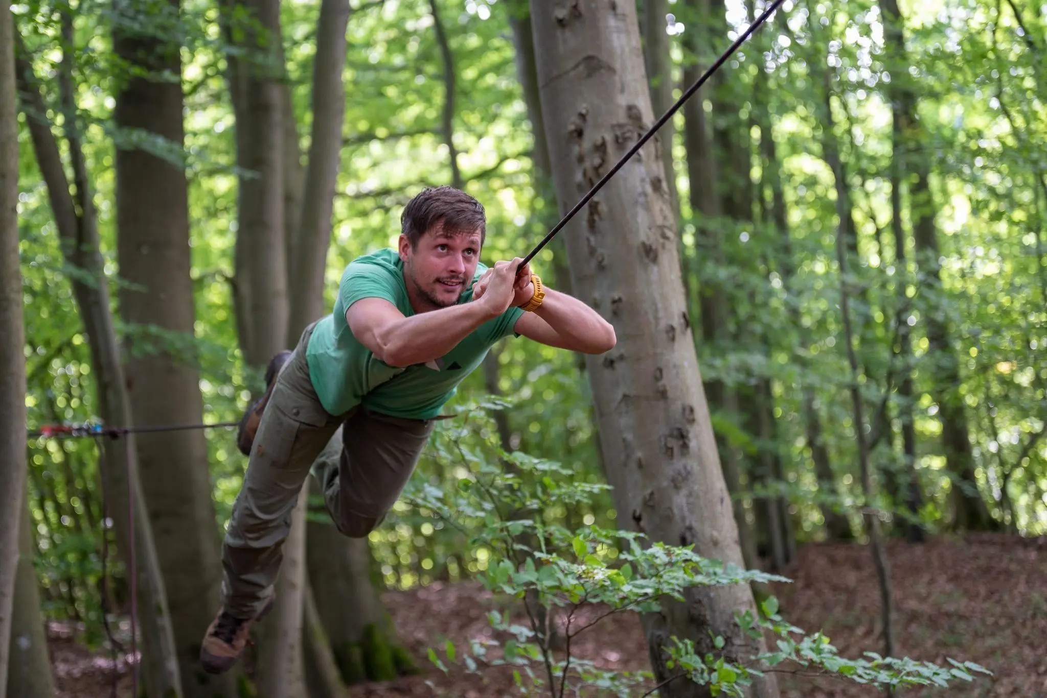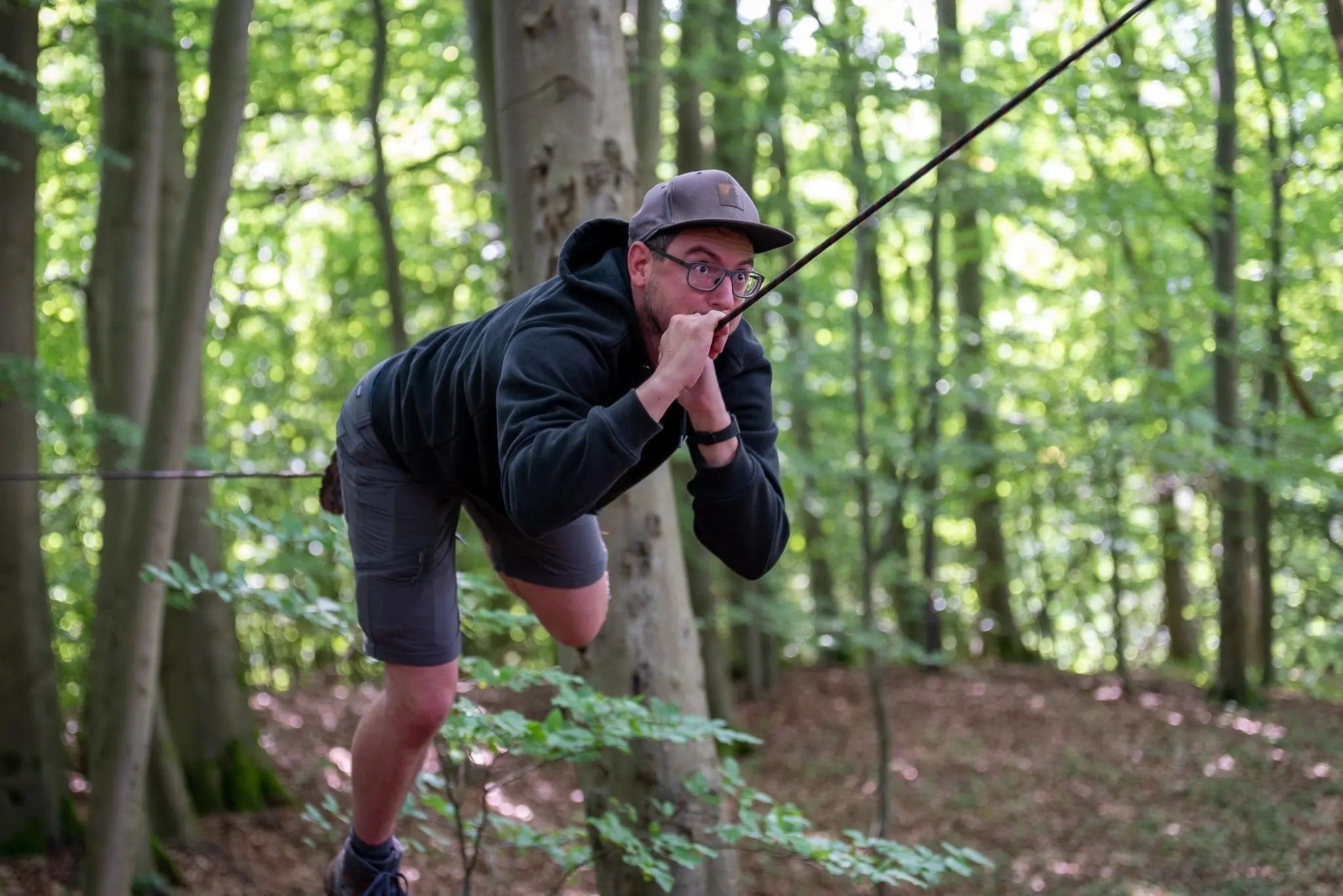 Mann schwingt an einer Seilbrücke zwischen Bäumen hindurch