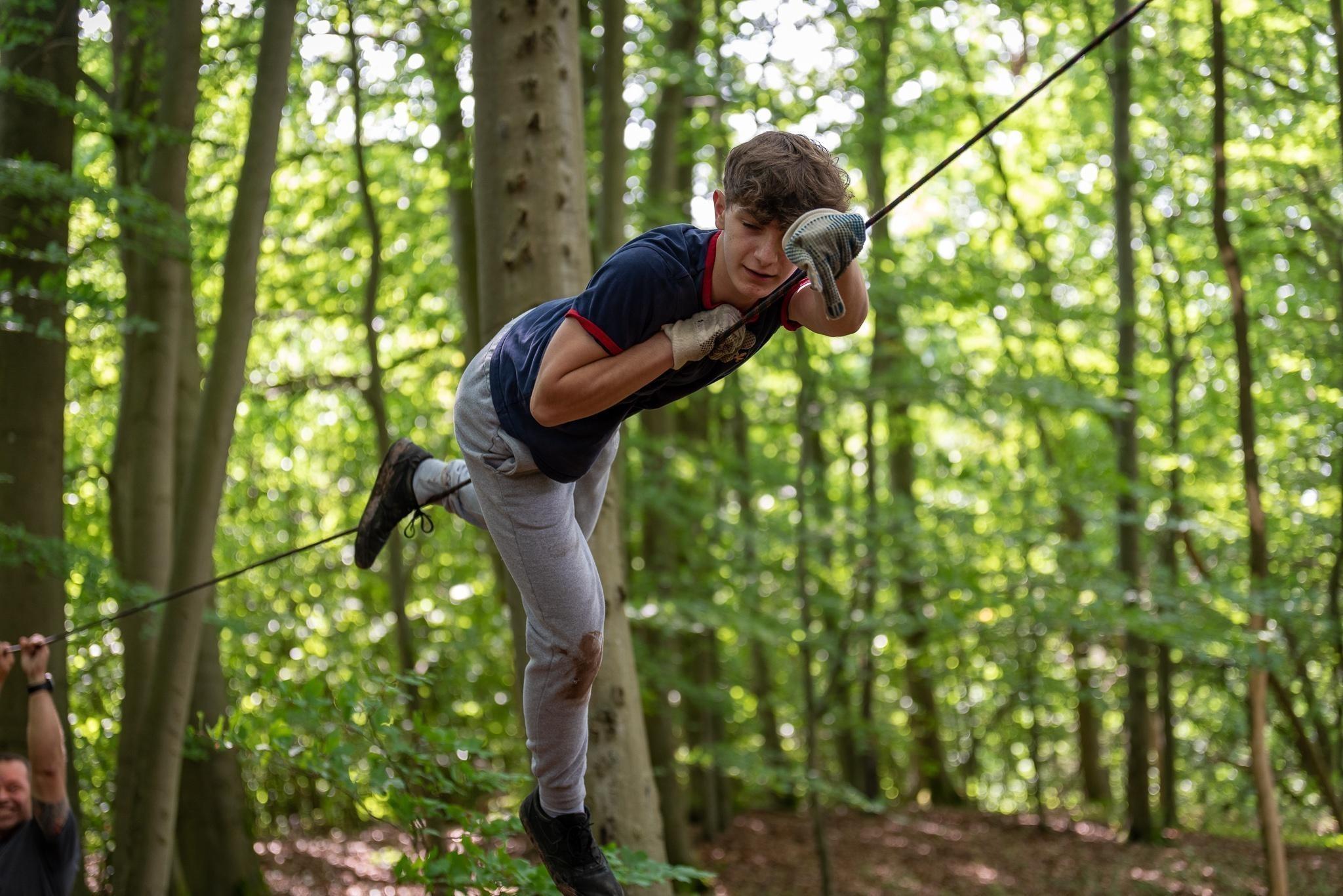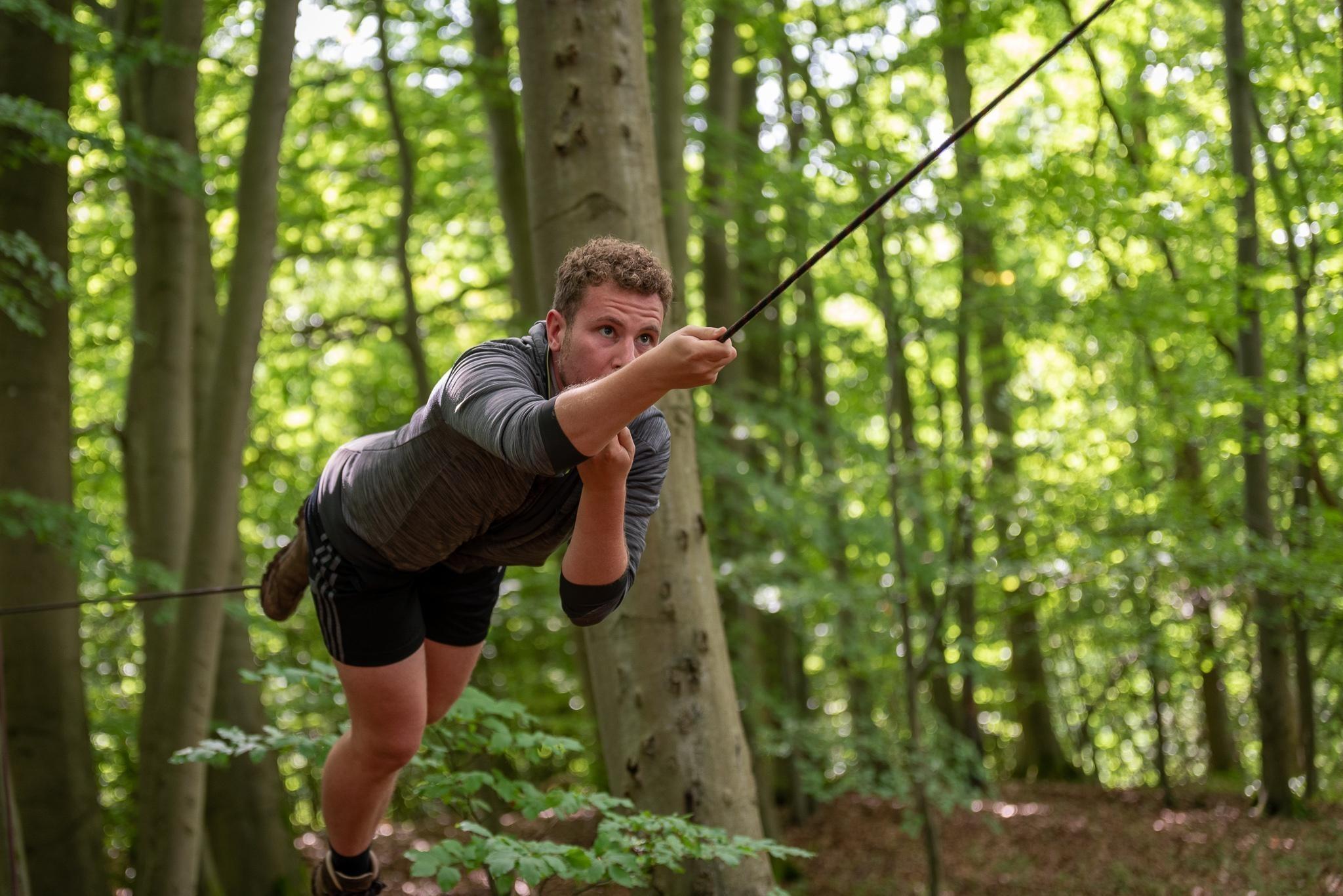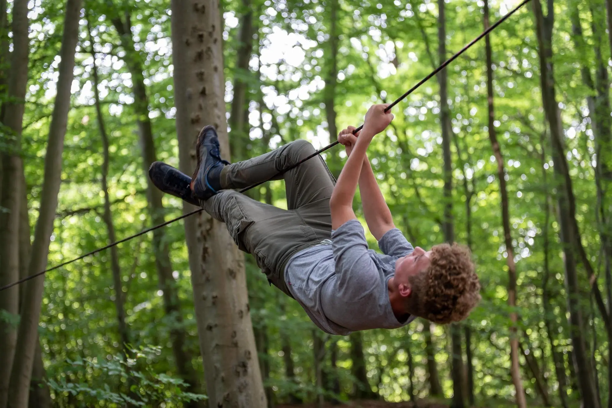 Mann schwingt an einer Seilbrücke zwischen Bäumen hindurch