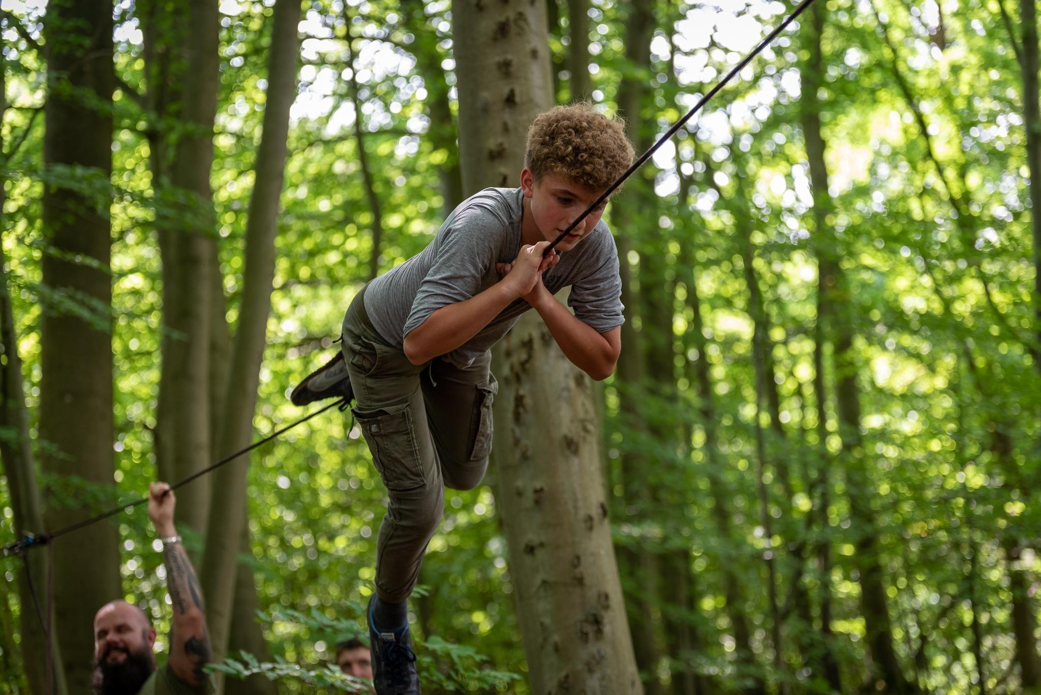 Junge überquert selbstgebaute Seilbrücke zwischen Bäumen im Wald