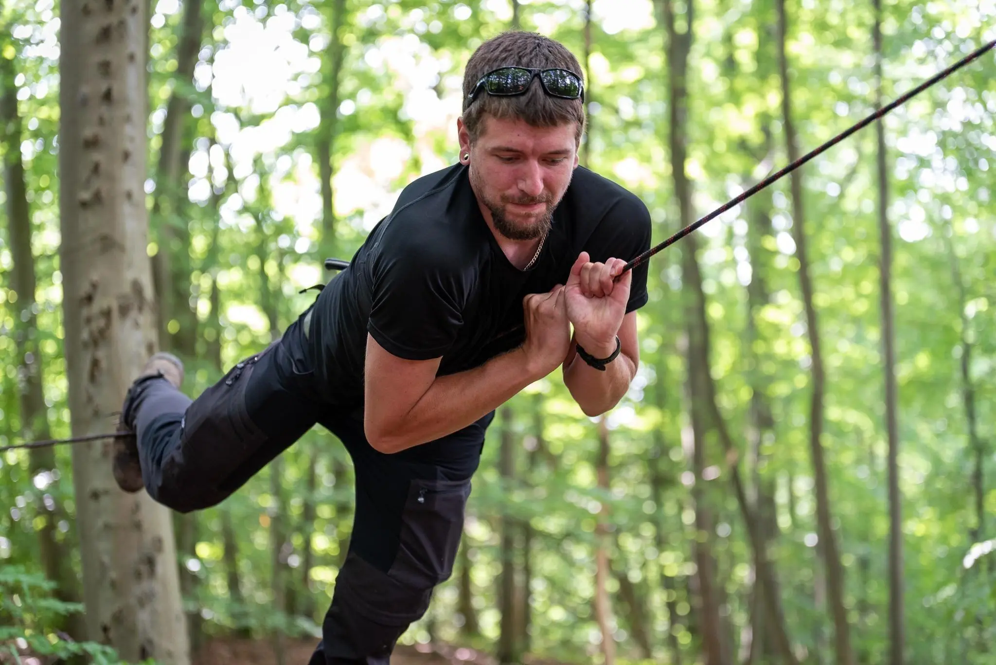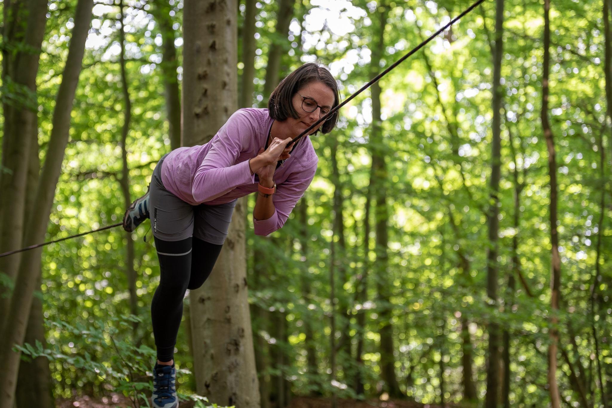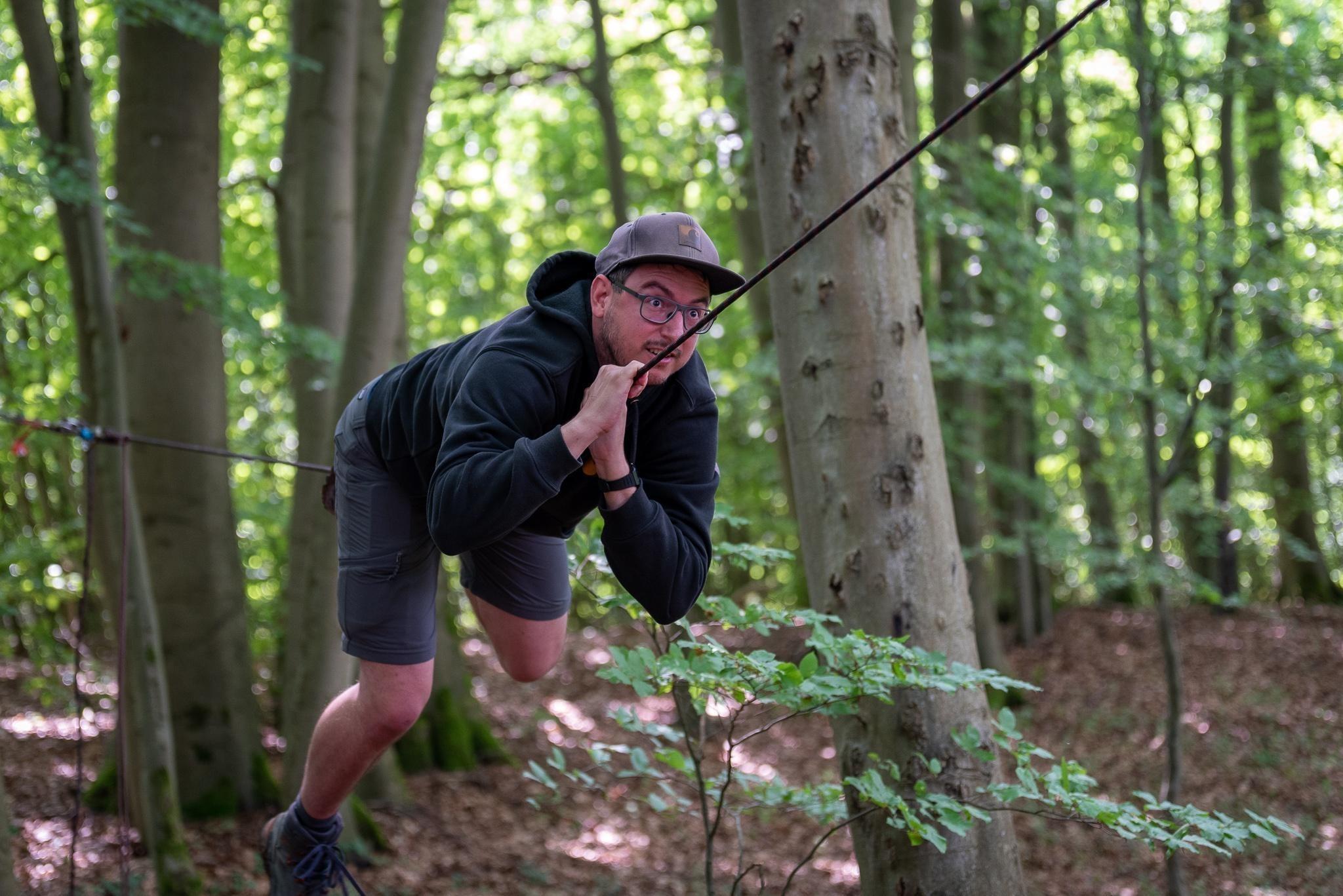 Person balanciert auf einer gespannten Schnur zwischen Bäumen im Wald