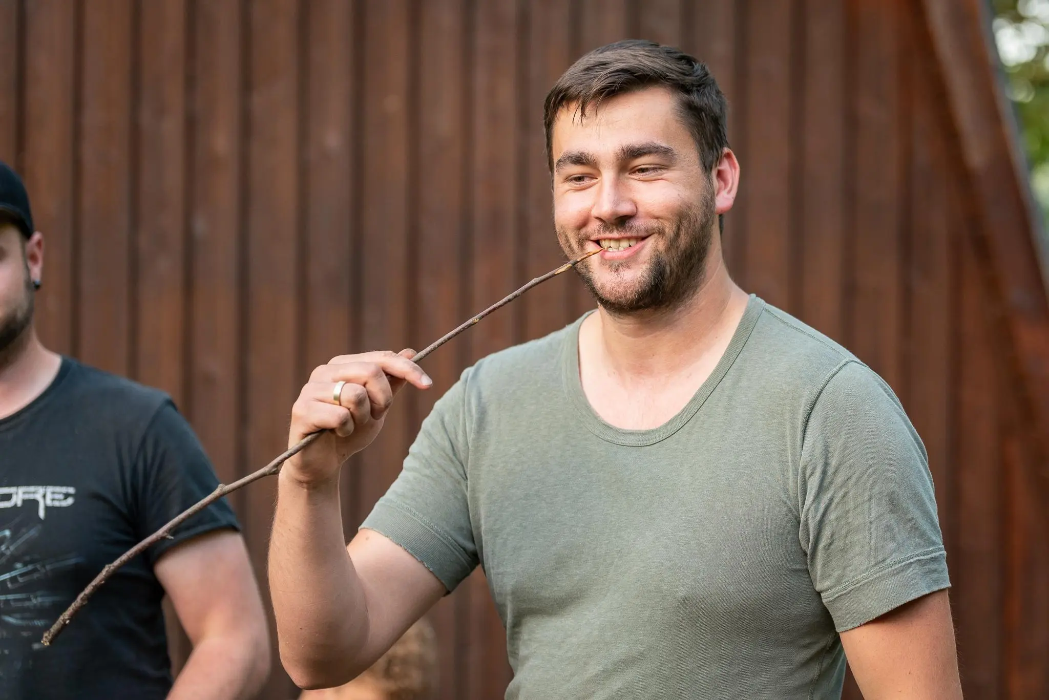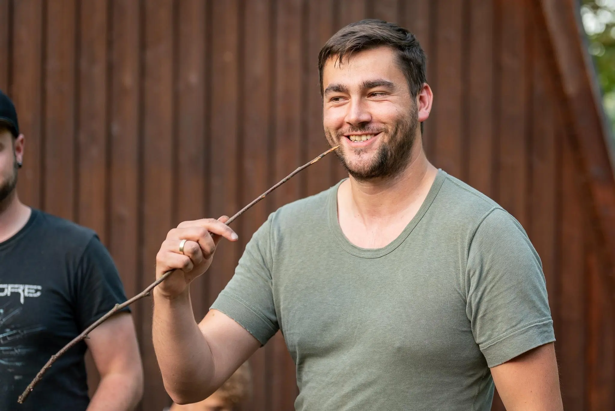 Mann hält einen Stock und lächelt vor einer Holzwand