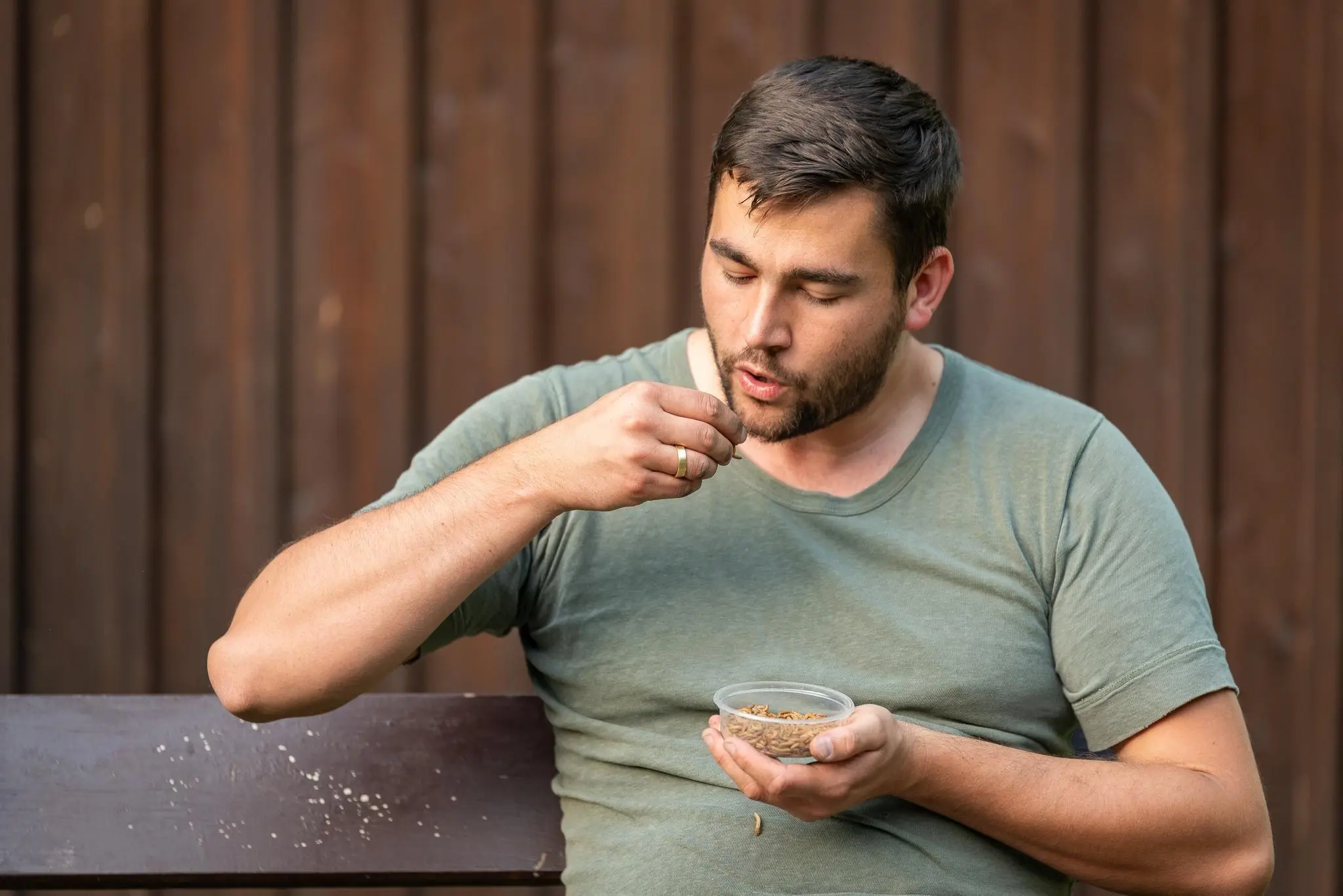 Mann isst aus einer Schüssel mit Samen und hält eine Hand zum Mund