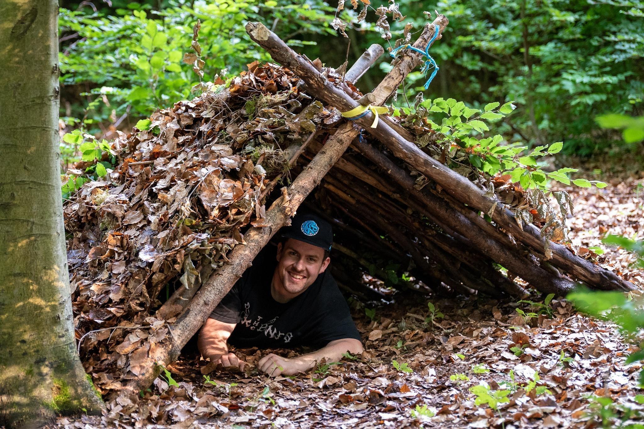 Mann liegt in einer Laubhütte aus Ästen und Blättern im Wald