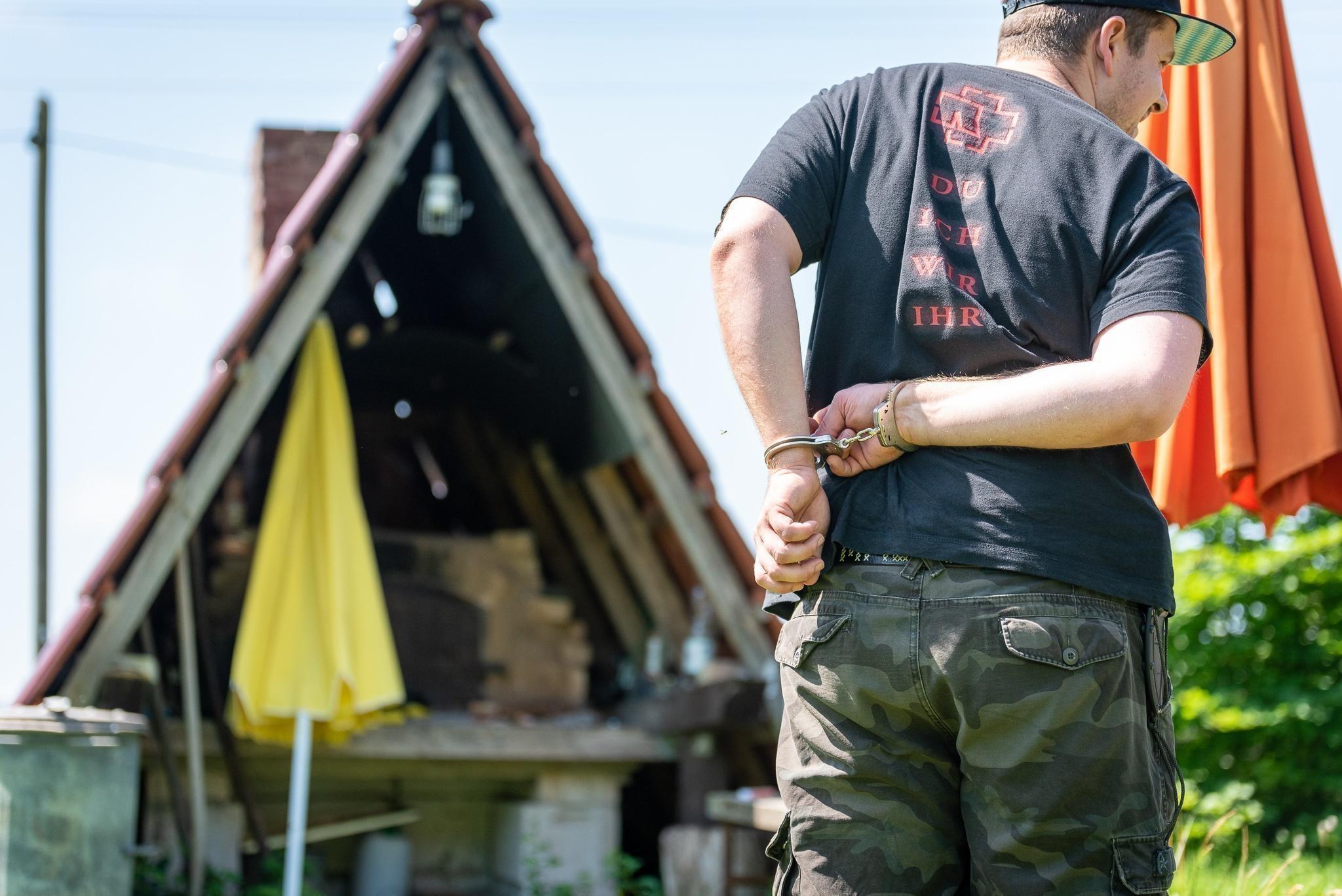Mann mit Handschellen hinter dem Rücken steht vor einer Holzkonstruktion
