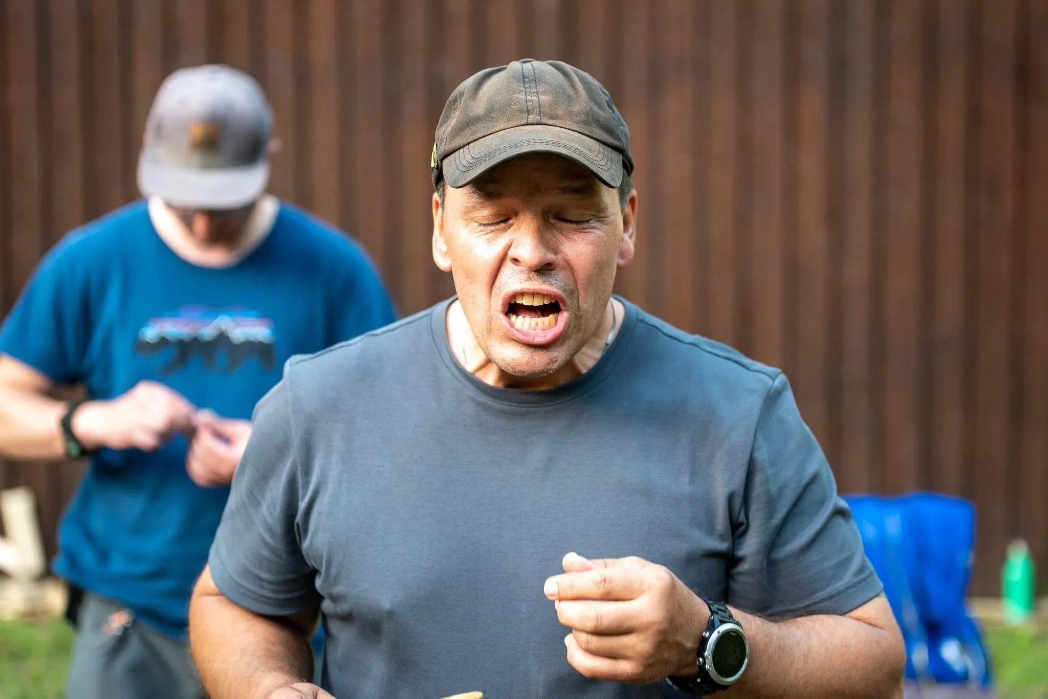 Mann hält einen Stock im Mund und spricht, während ein anderer Mann im Hintergrund steht
