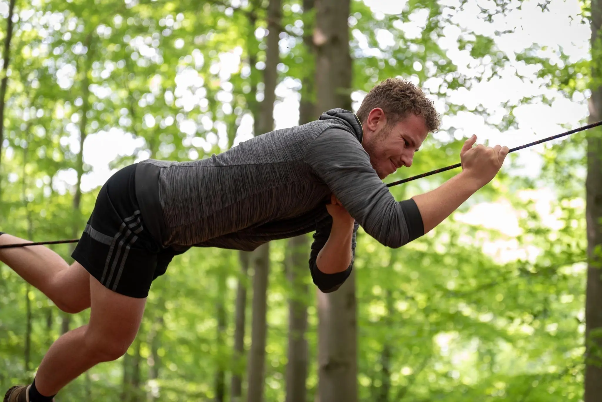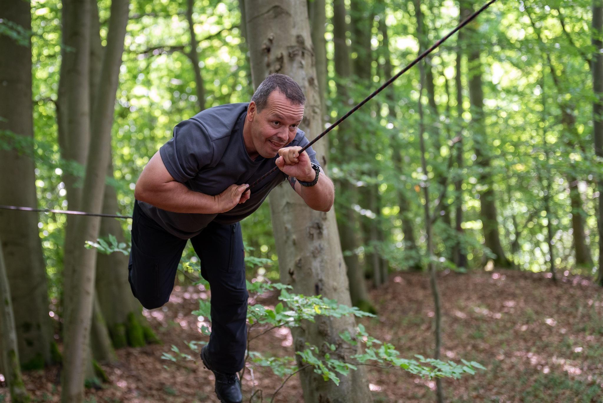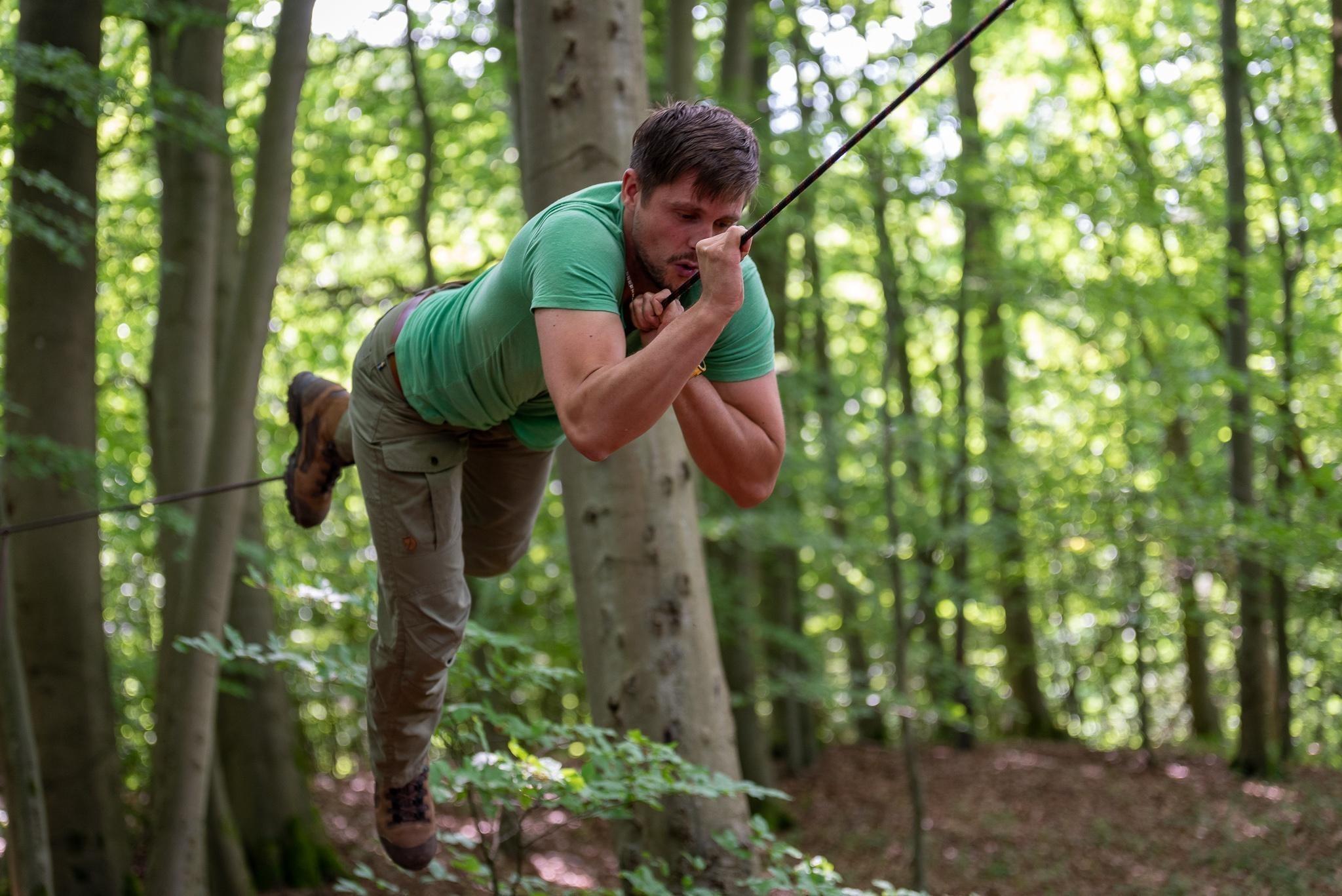 Mann schwingt an einem Seil zwischen Bäumen im Wald