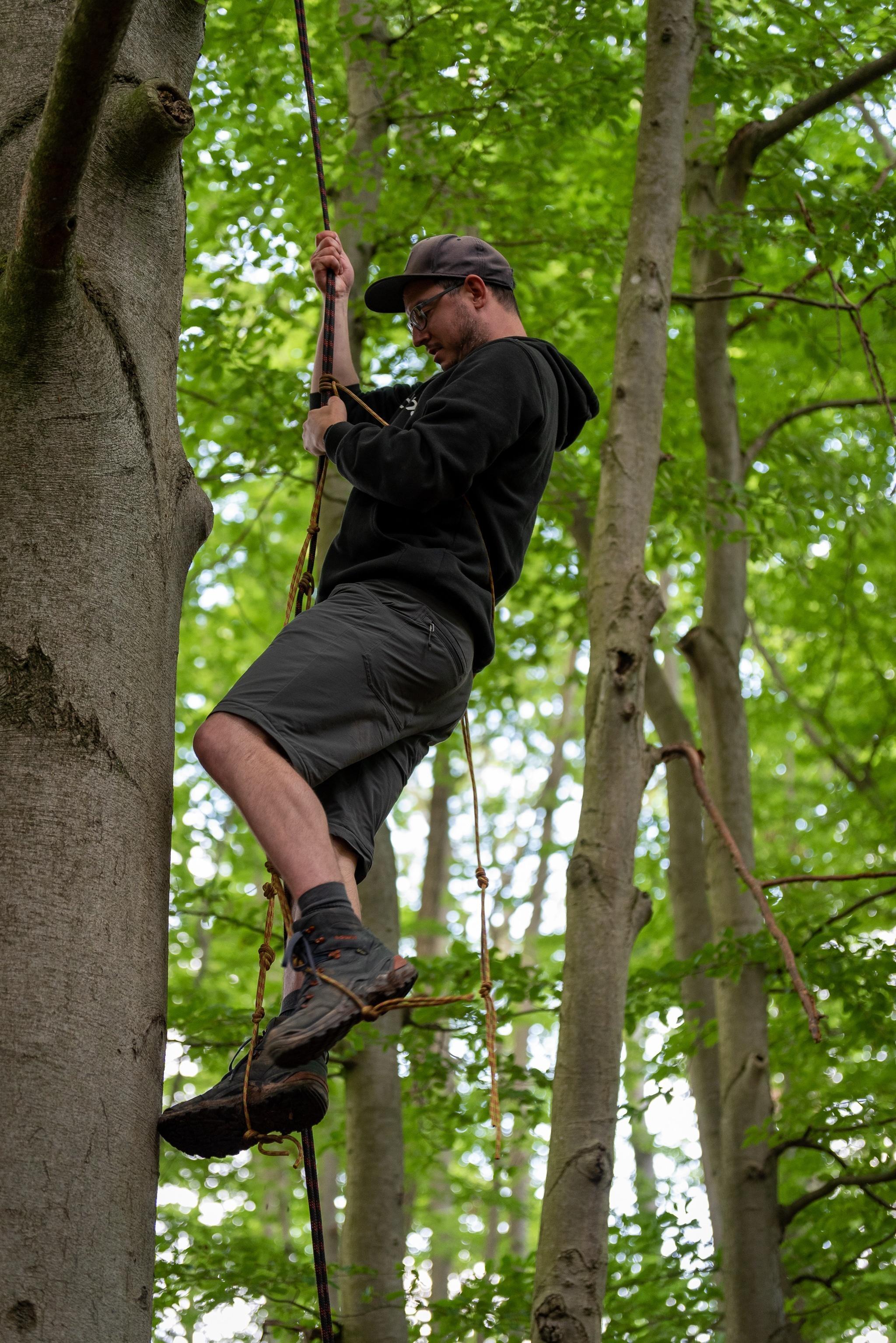 Kletterseil wird an Baumstamm befestigt, während eine Person hochsteigt