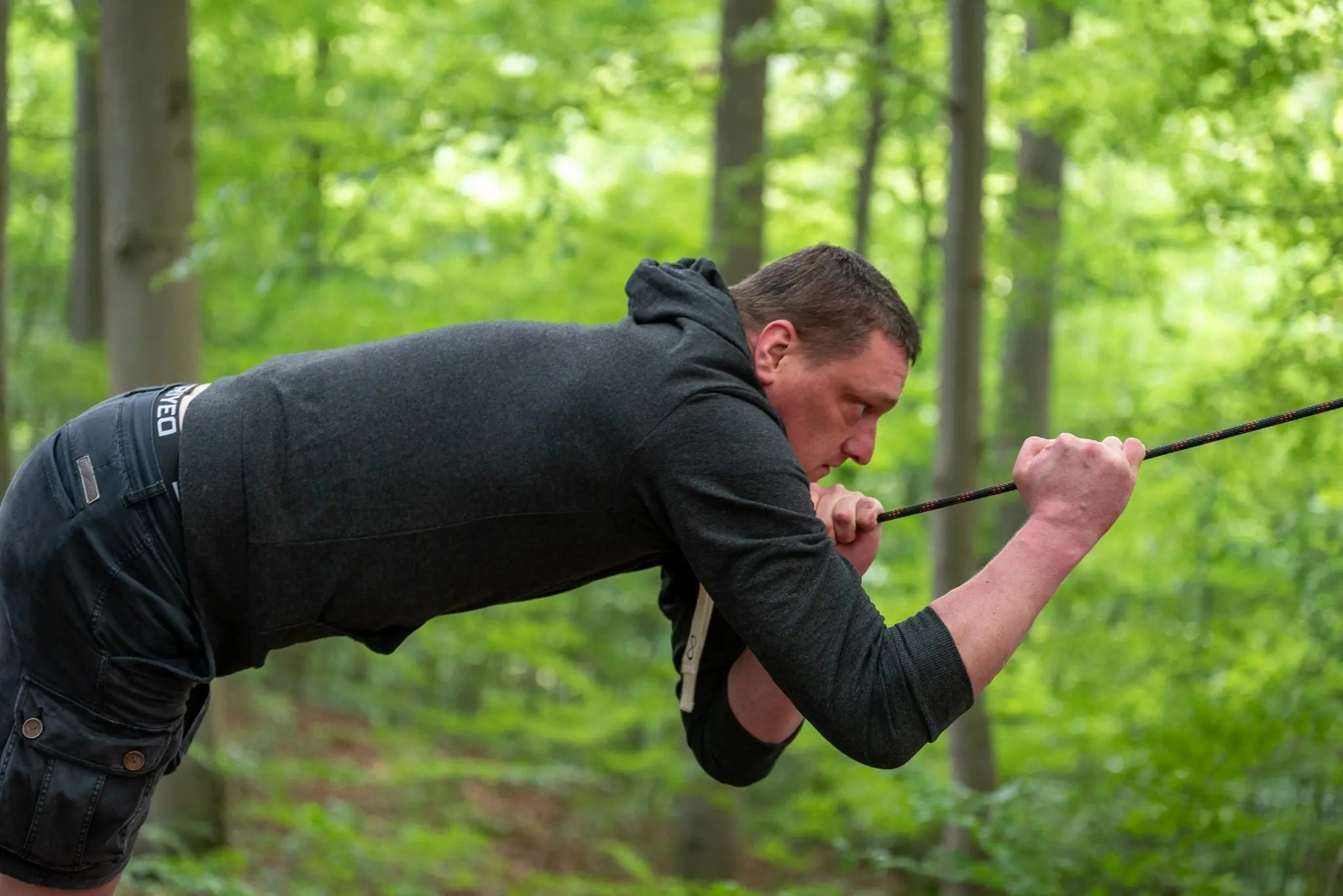 Seil wird gespannt, während sich der Körper nach vorne beugt