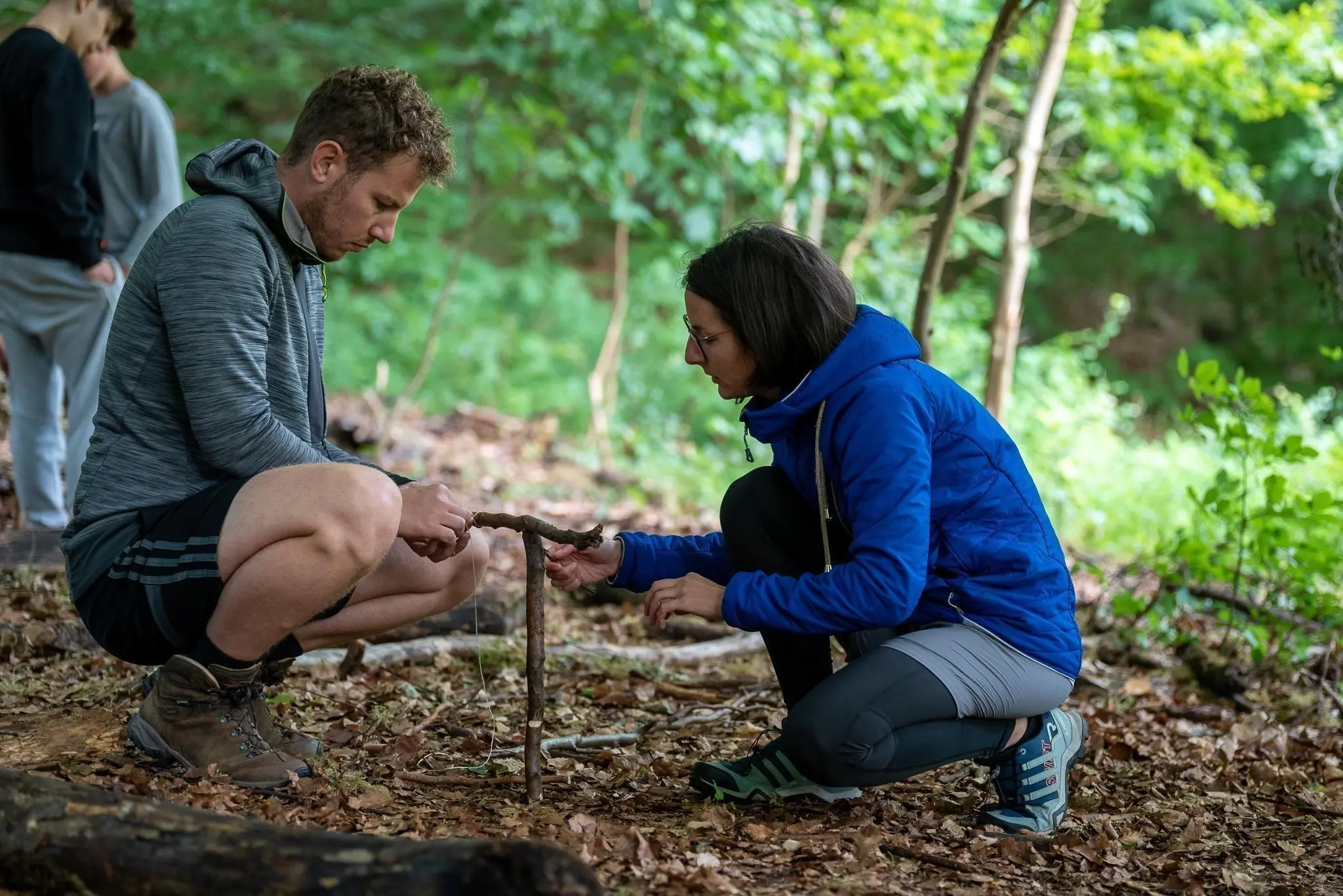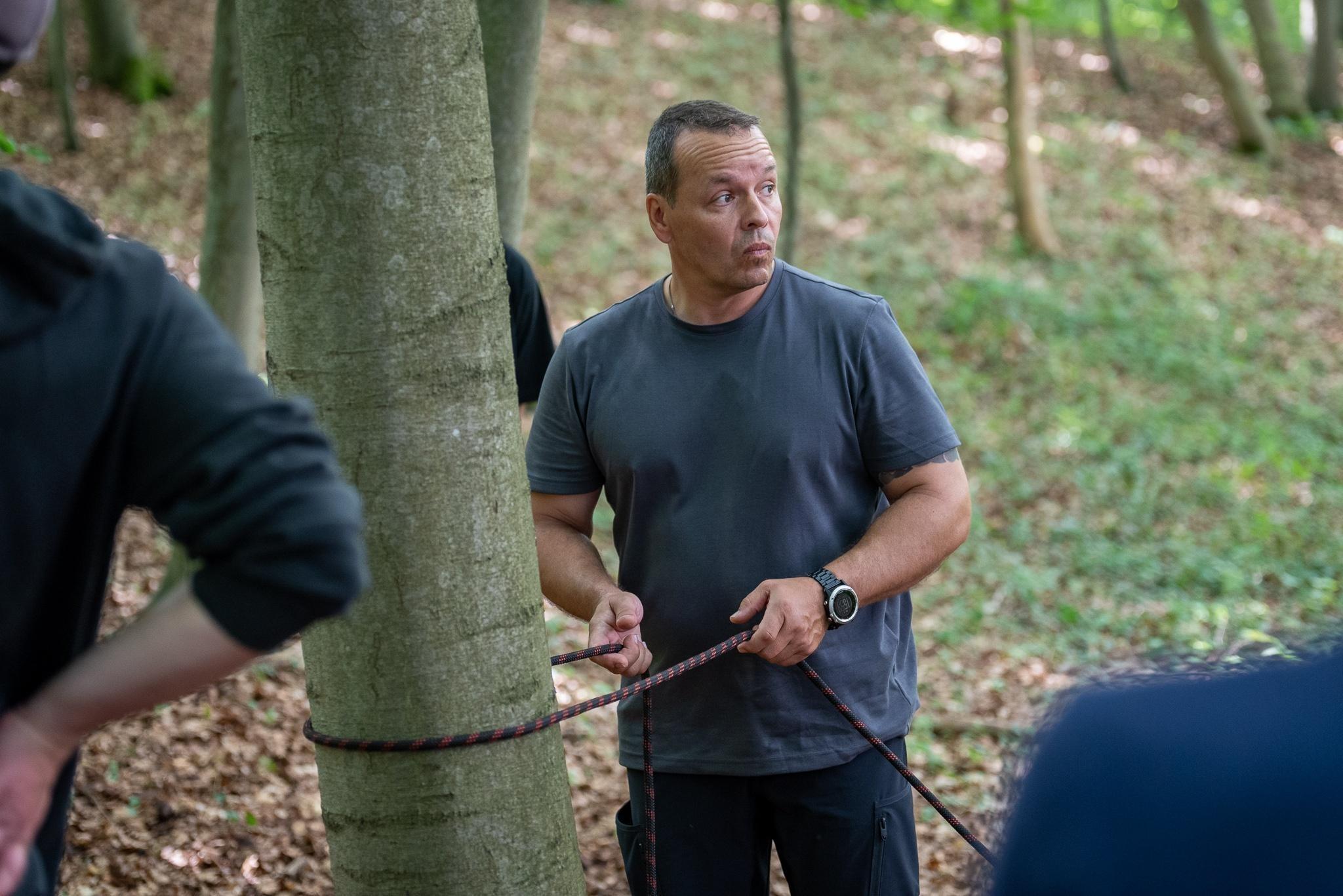 Mann mit Seil steht im Wald und erklärt einem Jugendlichen eine Technik