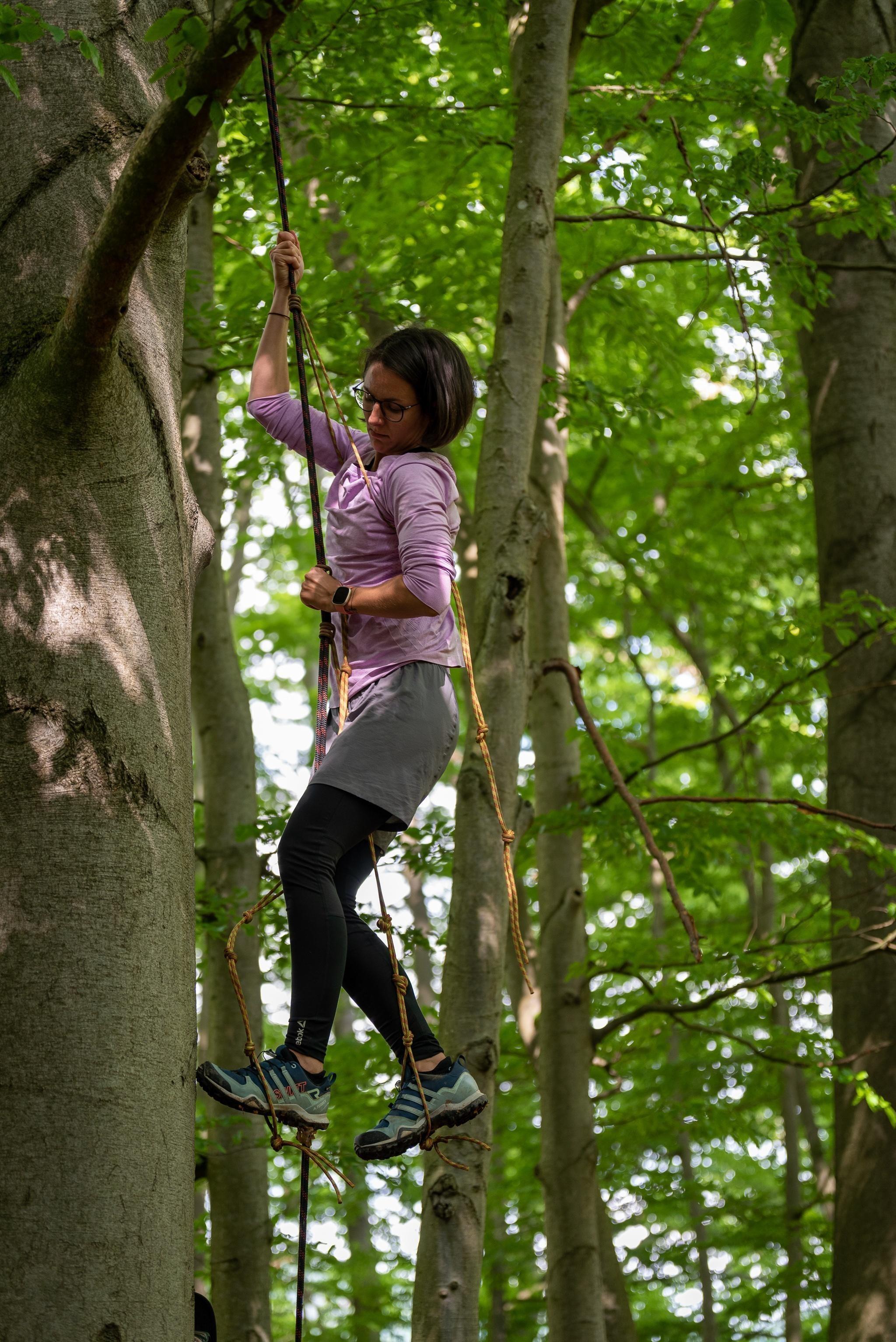 Seiltechnik wird an einem Baumstamm zur Fortbewegung genutzt