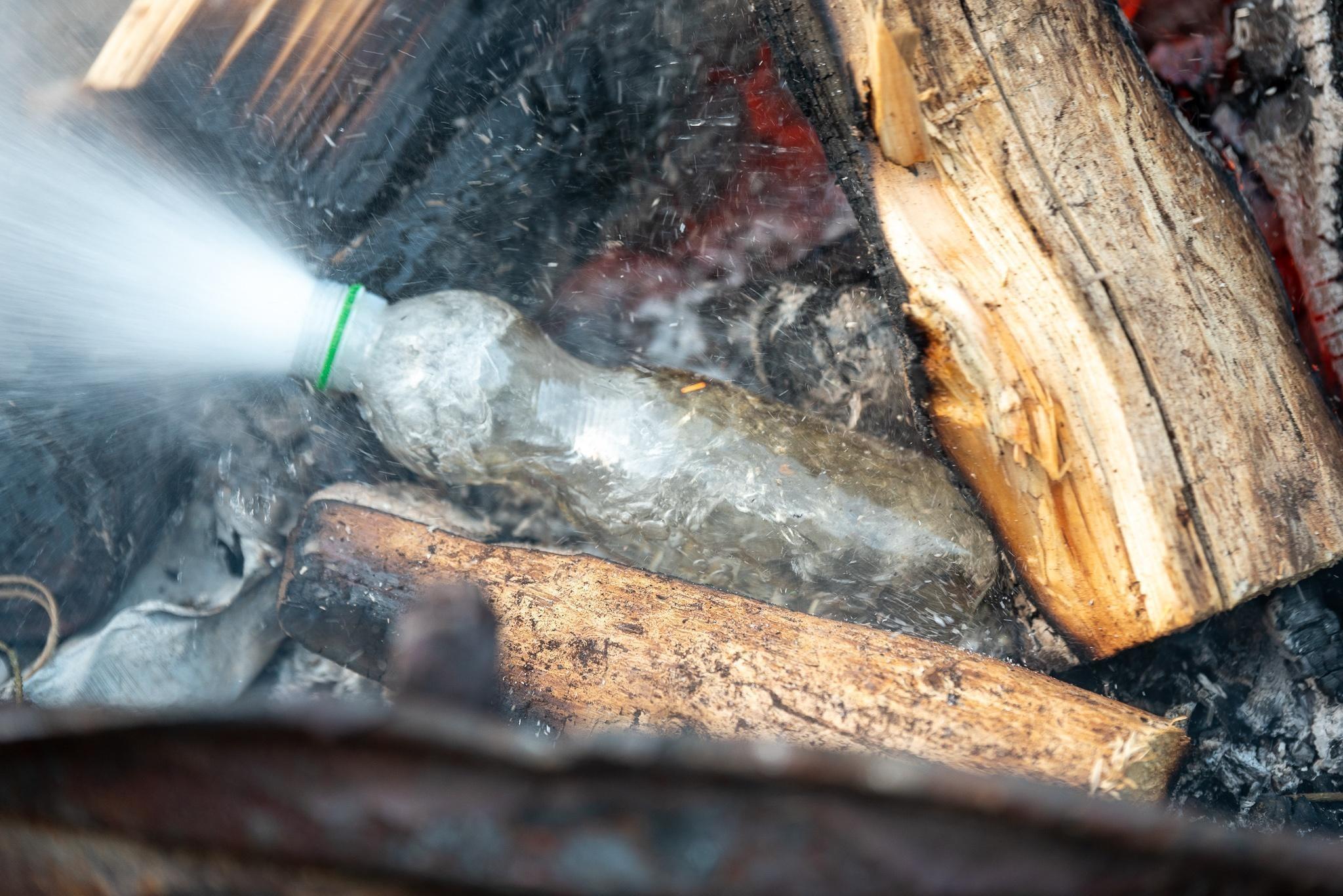 Wasserflasche sprüht Wasser auf brennendes Holz im Feuer