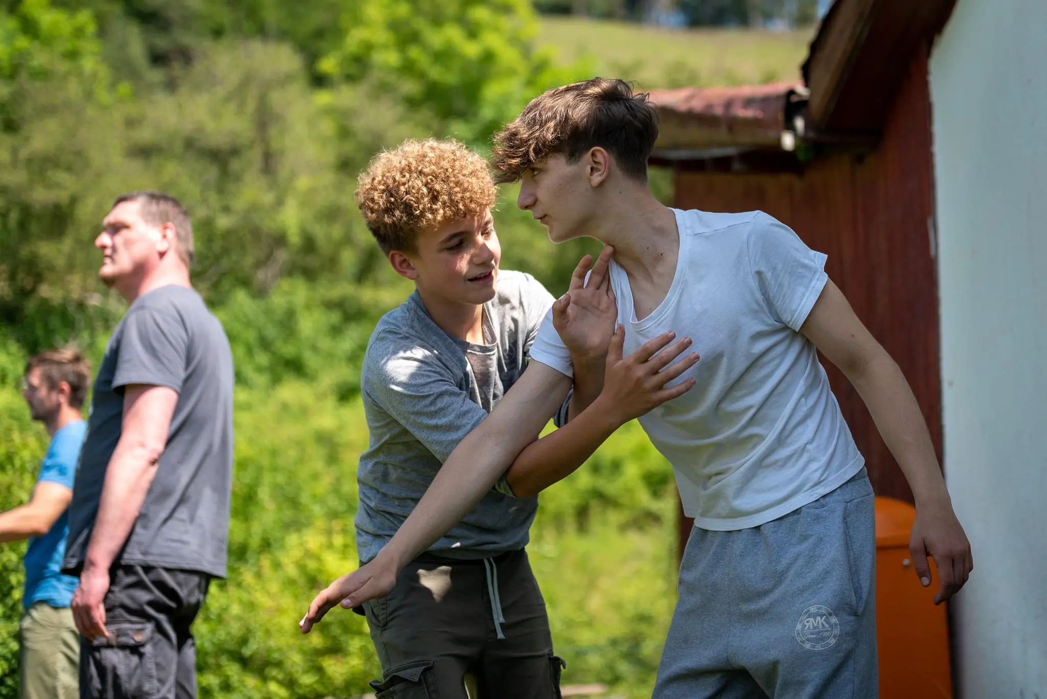 Zwei Jugendliche üben eine körperliche Technik in einer Trainingssituation