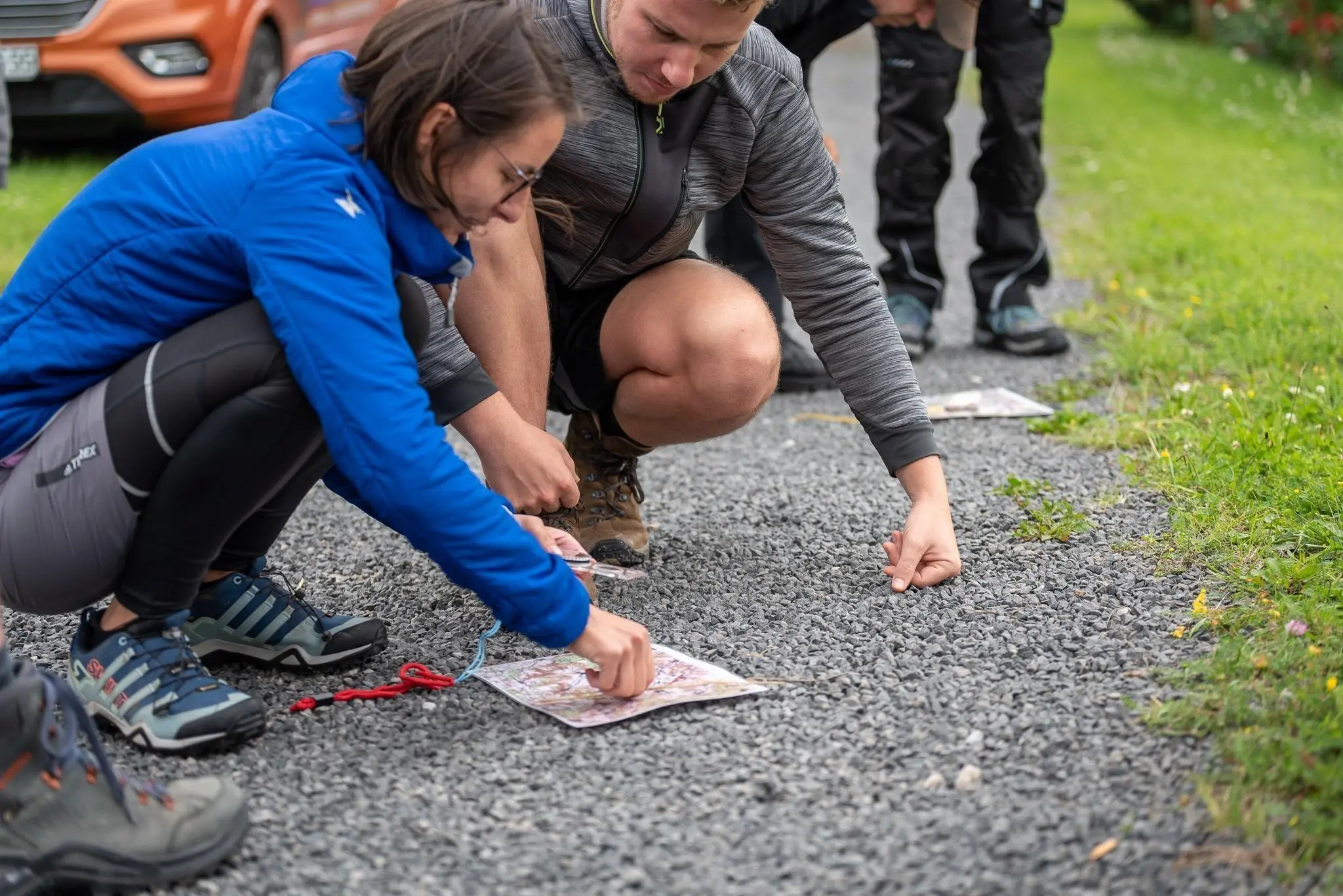 Zwei Personen analysieren eine Karte auf einem Kiesweg