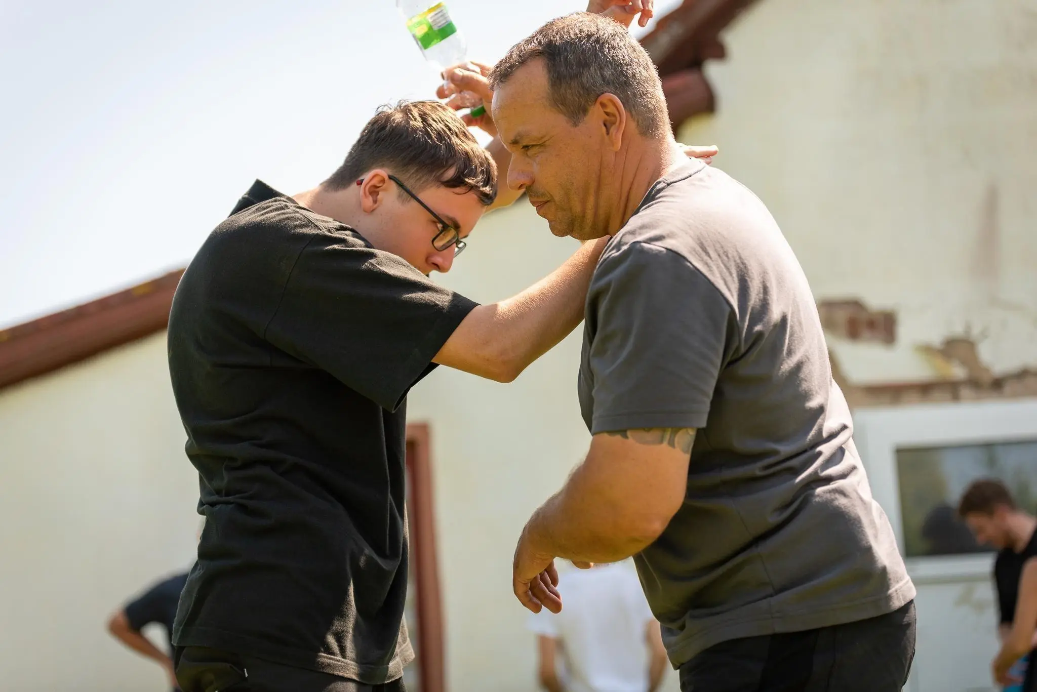 Zwei Personen üben eine Technik zur Selbstverteidigung im Freien