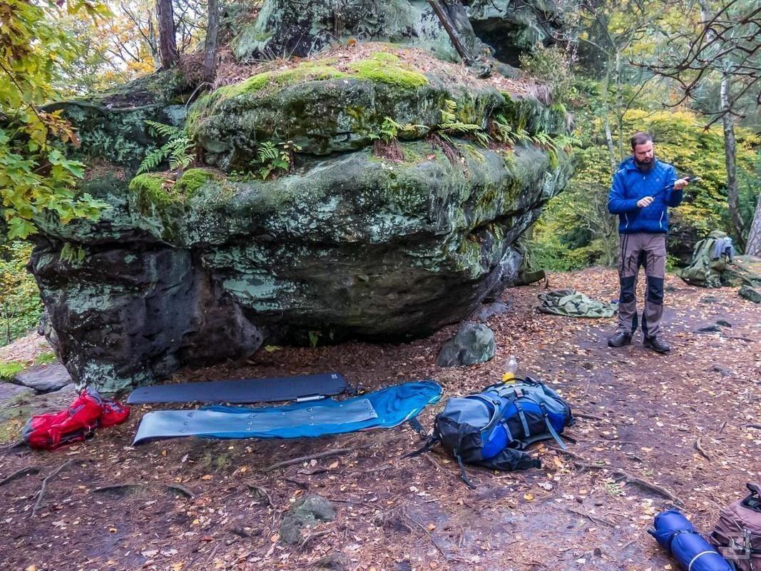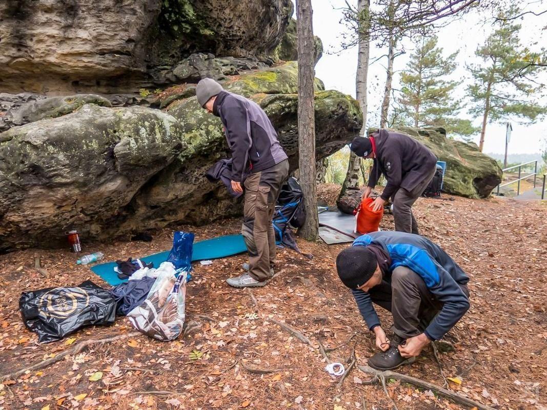 Drei Personen bereiten Ausrüstung unter einem Felsen im Wald vor