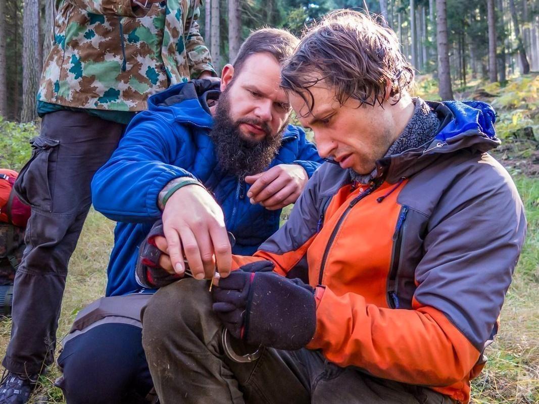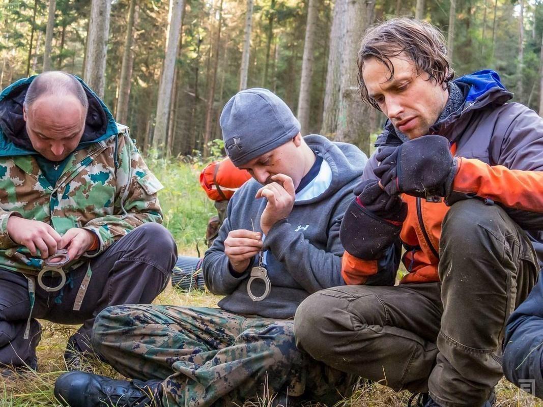 Drei Personen konzentrieren sich auf das Fädeln von Handschellen in einem Wald