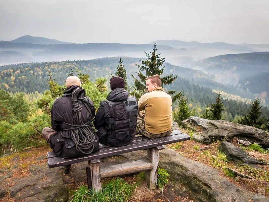 Drei Personen sitzen auf einer Bank und blicken auf eine bewaldete Landschaft