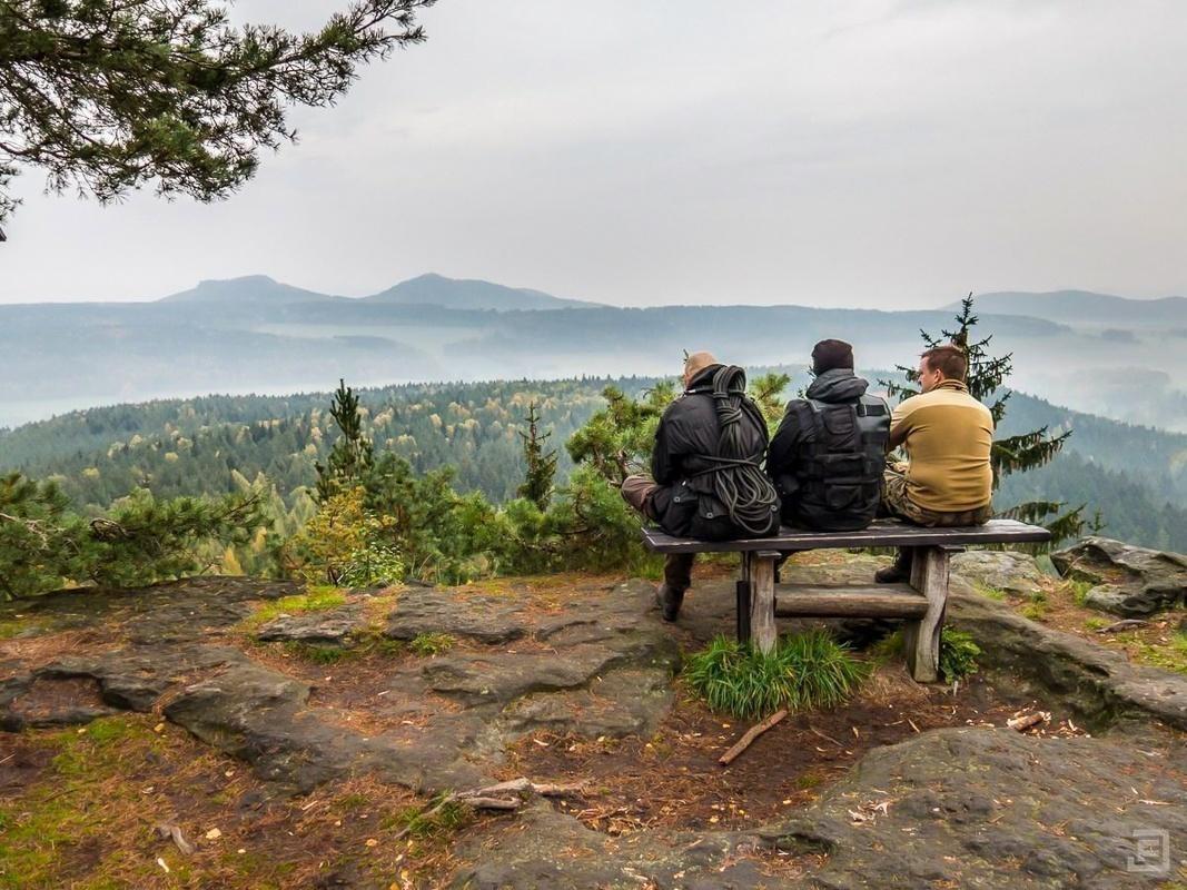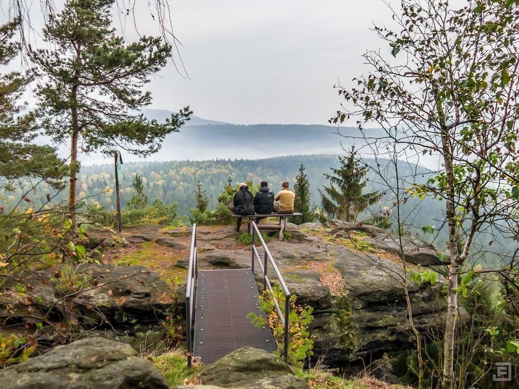 Gruppe steht auf einem Felsen mit Blick auf bewaldete Hügel und Nebel