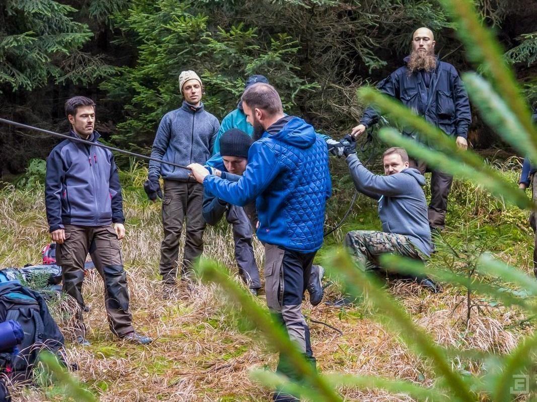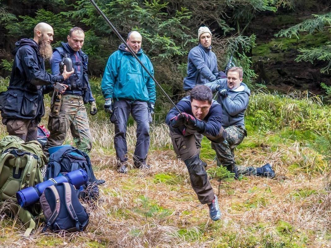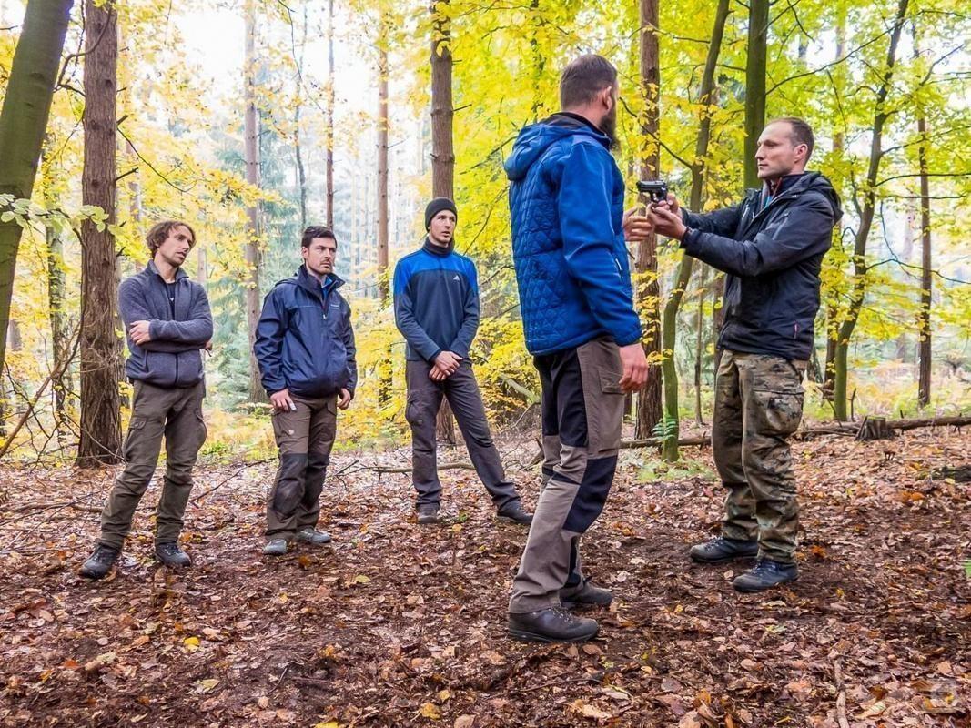 Gruppendynamik im Wald, eine Person demonstriert eine Technik mit einer Waffe