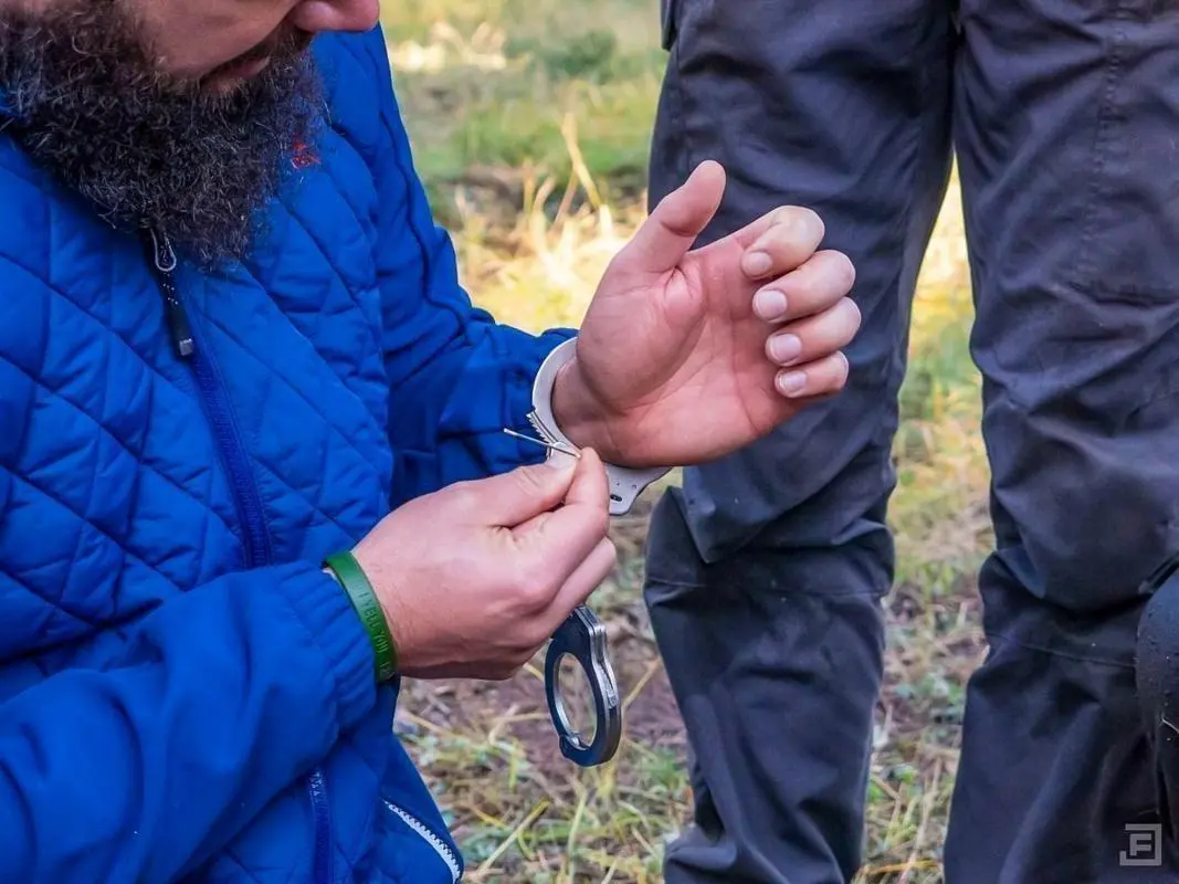 Mann untersucht Handschellen im Wald, ein weiterer Mann steht im Hintergrund