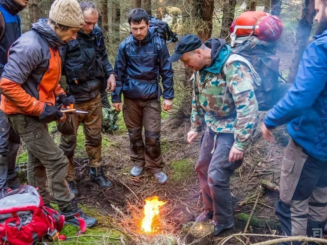 Gruppe diskutiert um ein Zundernest im Wald, einige halten Werkzeuge in der Hand