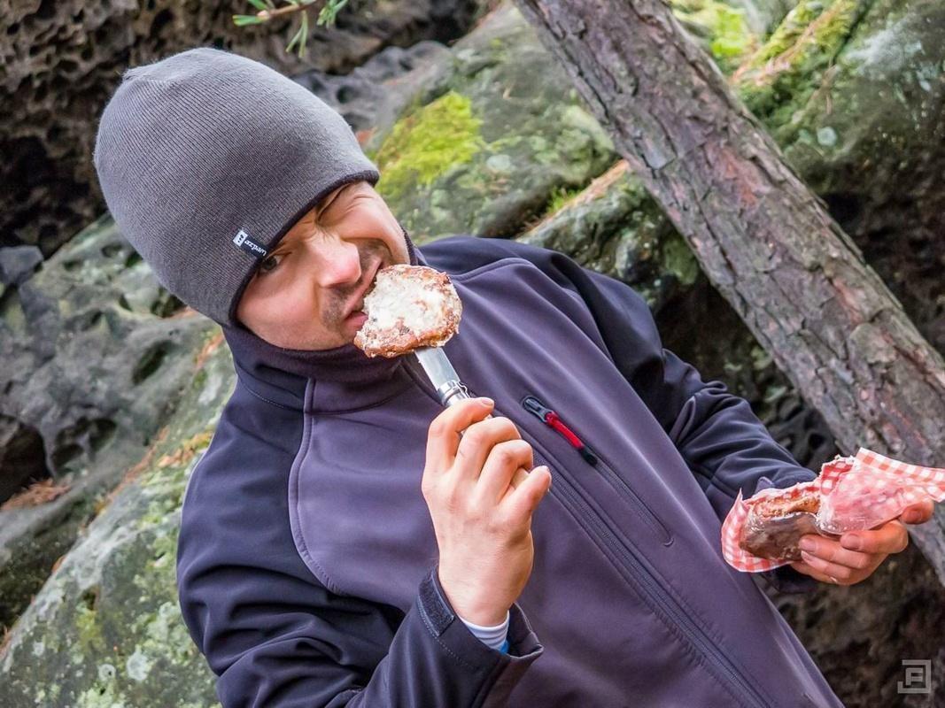 Mann hält einen Löffel mit Essen in der Hand, steht vor einer Felswand