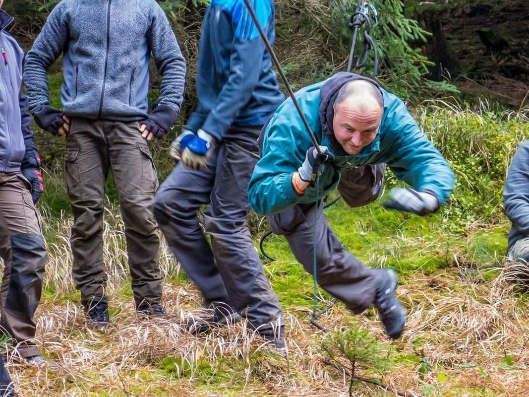 Vier Personen arbeiten gemeinsam an einer Seiltechnik im Wald