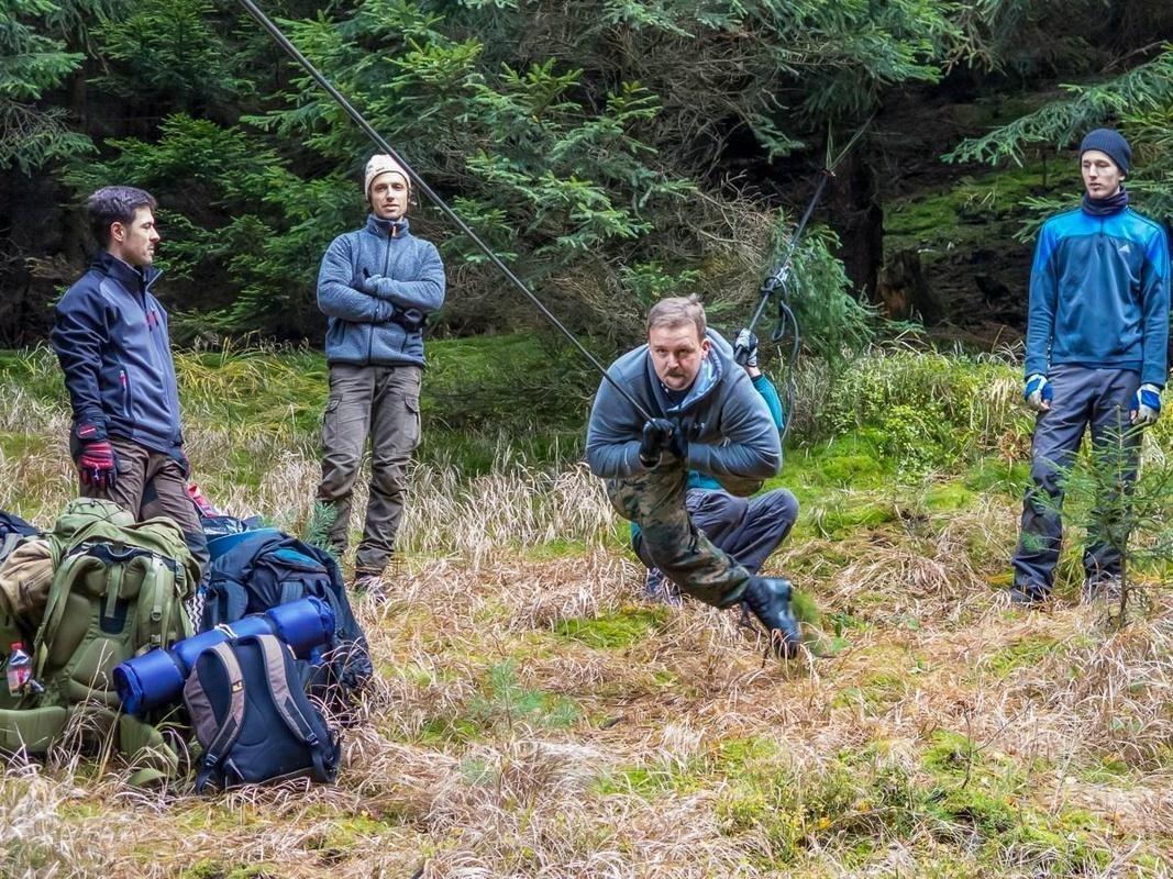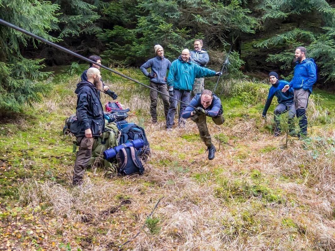Gruppierung arbeitet an einer selbstgebauten Seilquerung im Wald