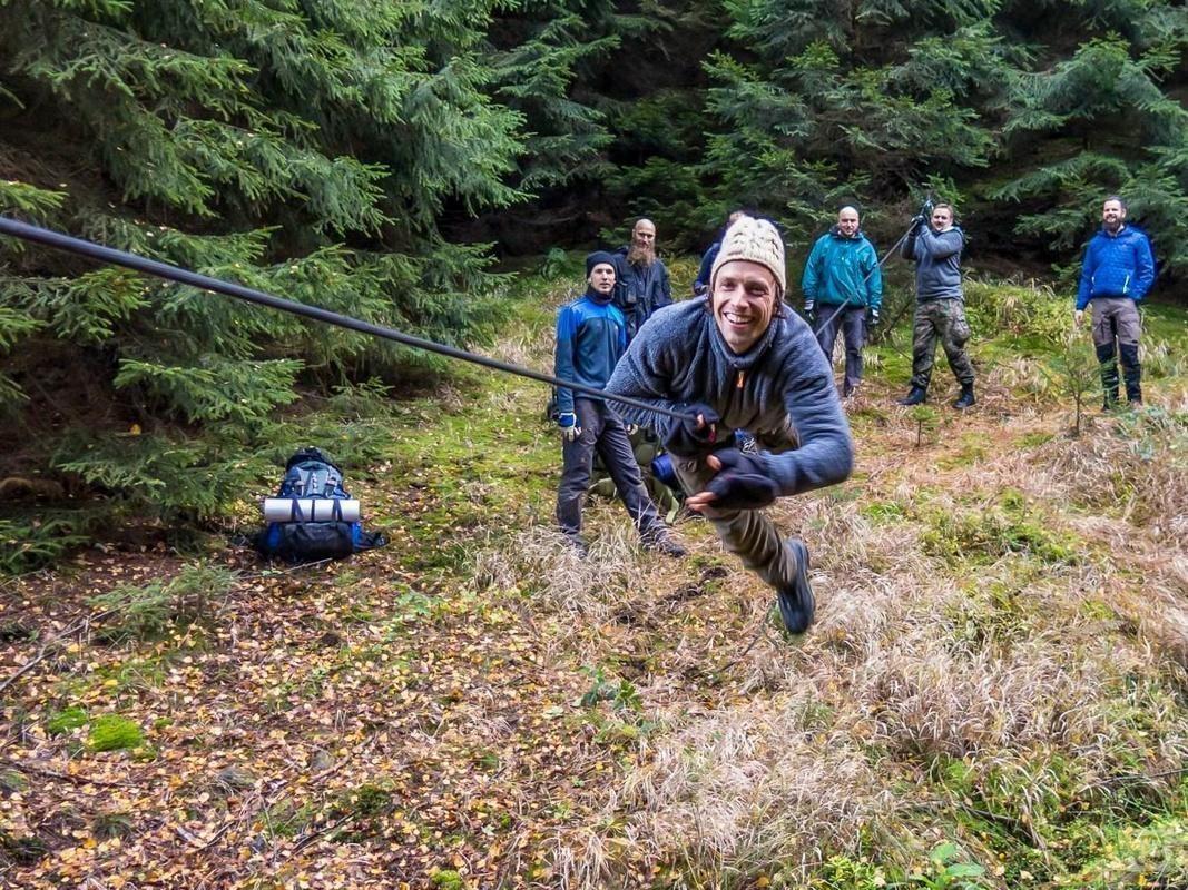 Seilquerung mit selbstgebauter Seilbrücke durch Teilnehmer im Wald