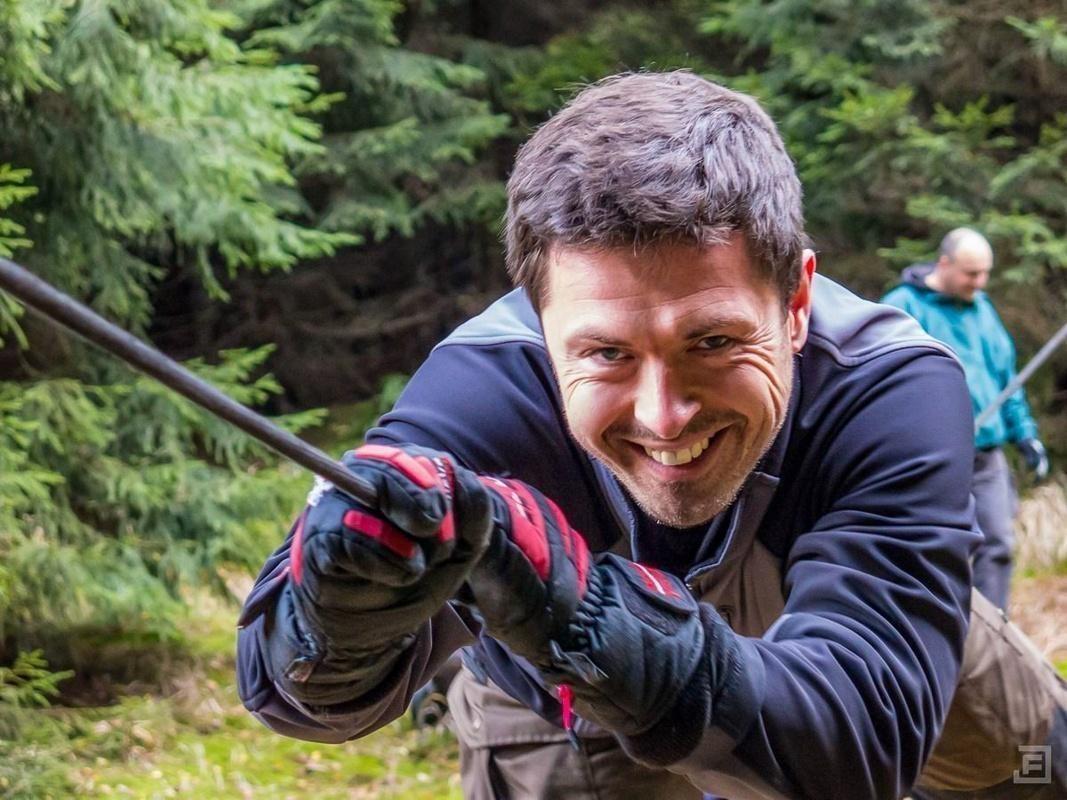 Mann zieht an einem Seil während andere zuschauen, im Wald auf Grasboden