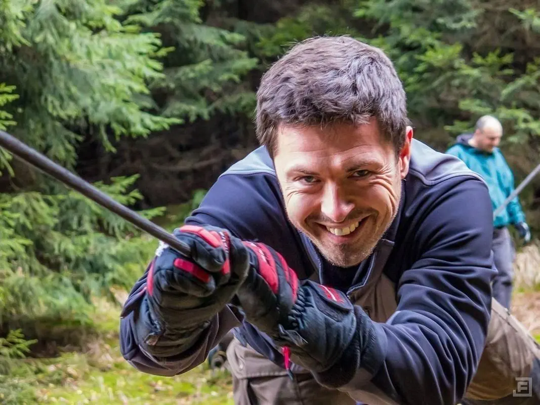 Mann zieht an einem Seil während einer Seilquerung im Wald