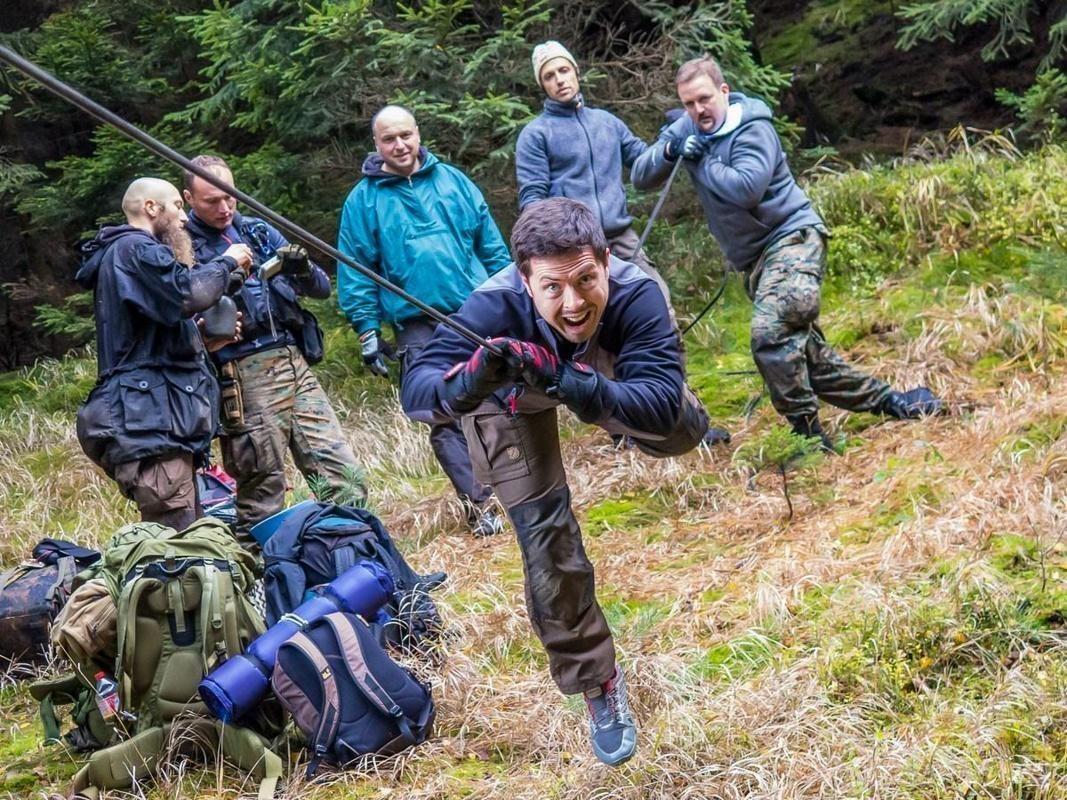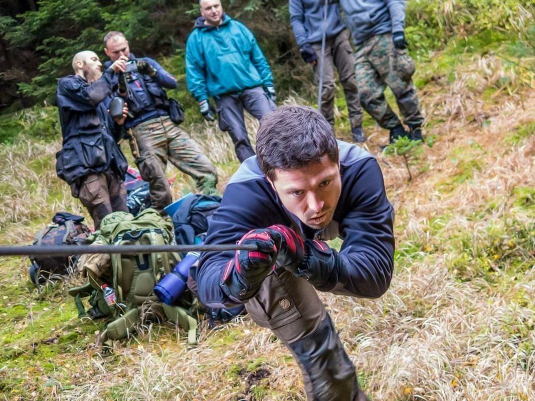 Mann zieht sich an einem Seil über unebenes Gelände, Rucksäcke im Hintergrund