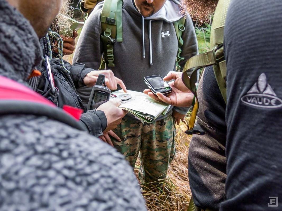 Mehrere Personen betrachten eine Karte und nutzen GPS-Geräte zur Navigation