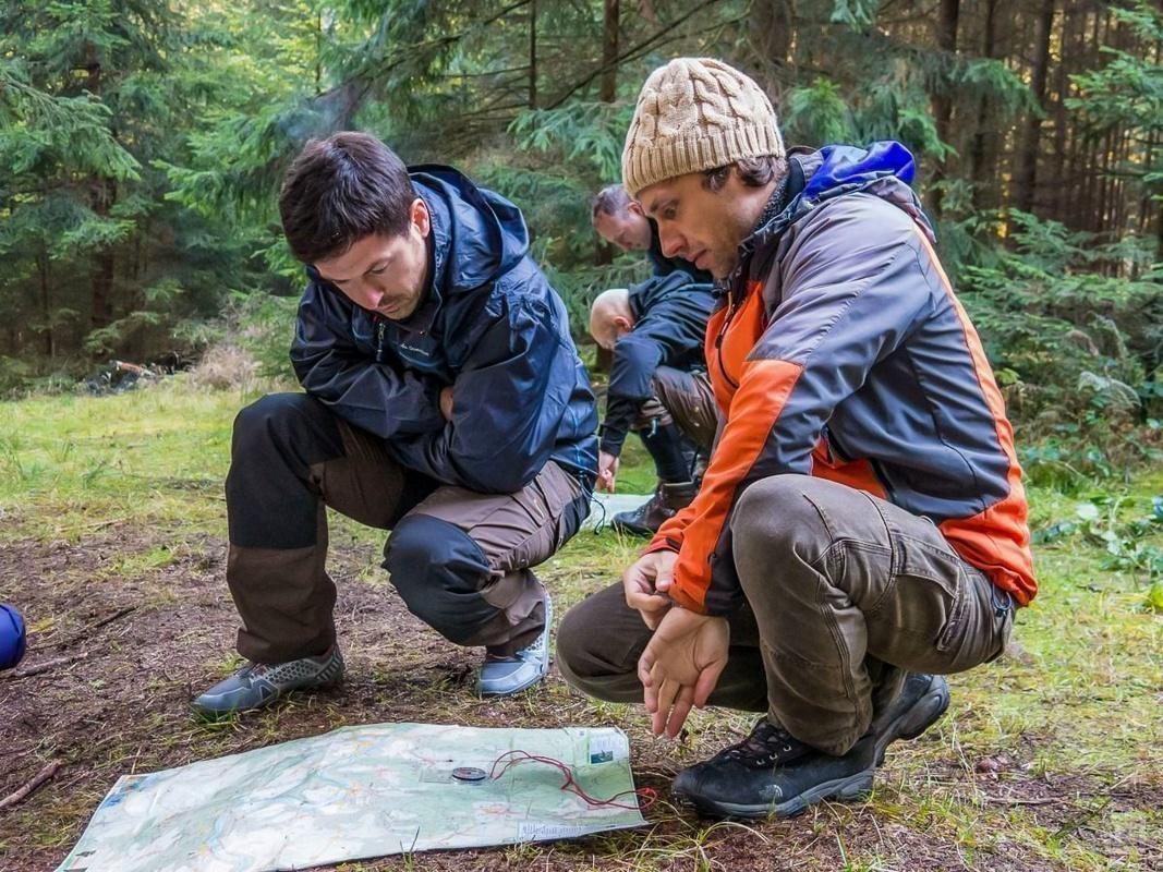 Zwei Personen überprüfen gemeinsam eine Kompassnadel im Wald