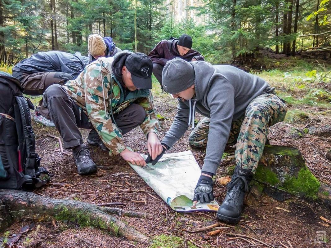 Gruppendiskussion über Karten und Navigation im Wald mit Rucksäcken