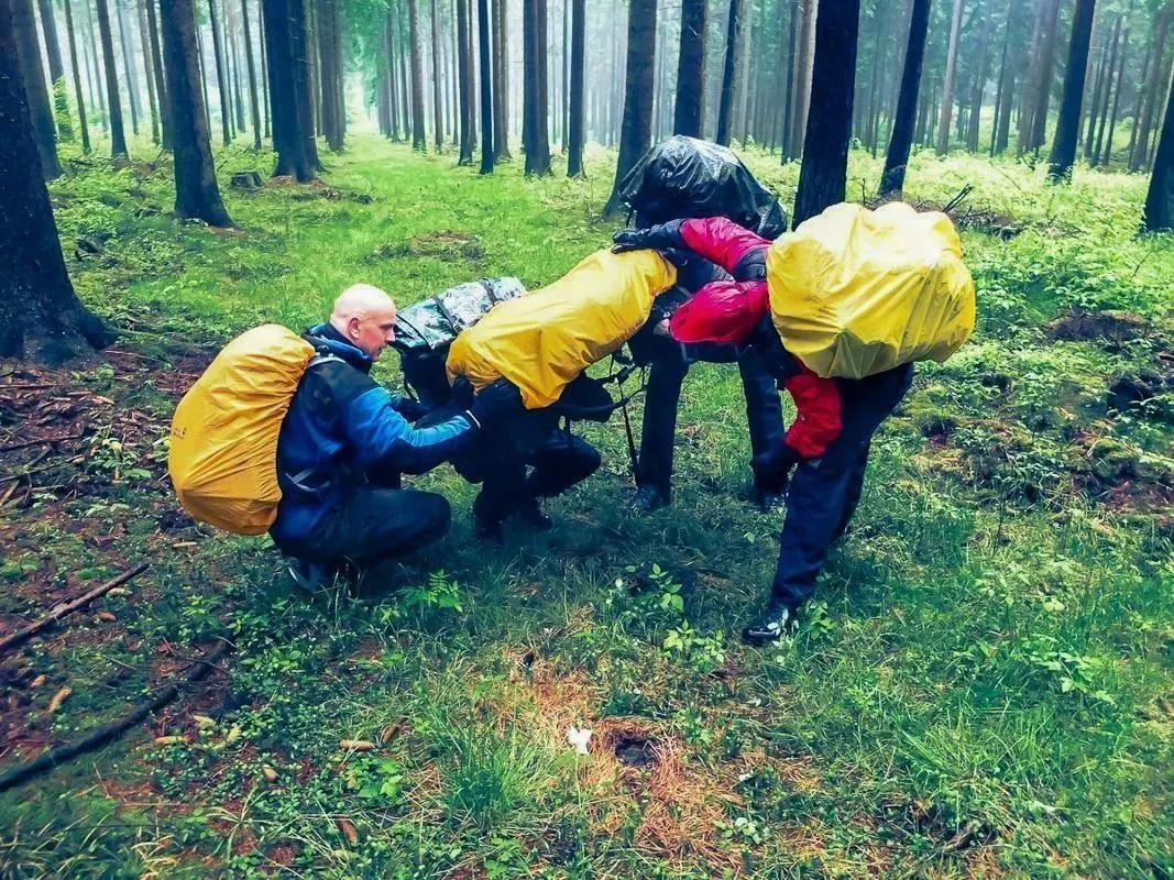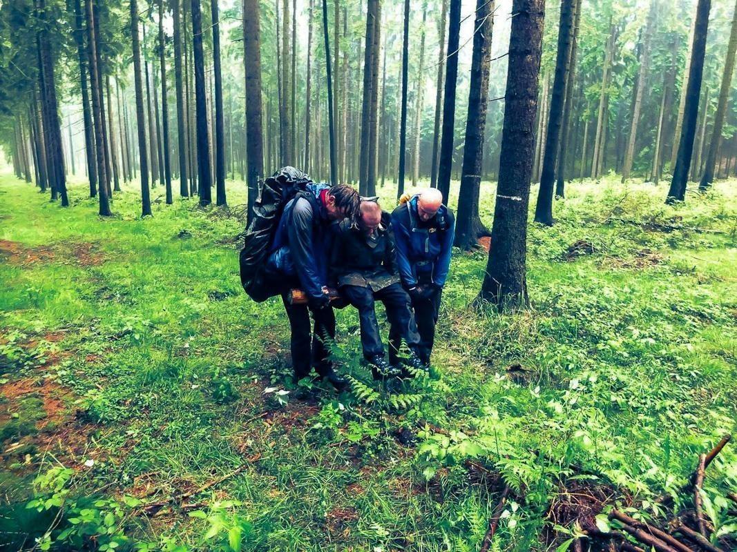 Drei Personen tragen gemeinsam eine improvisierte Trage durch den Wald