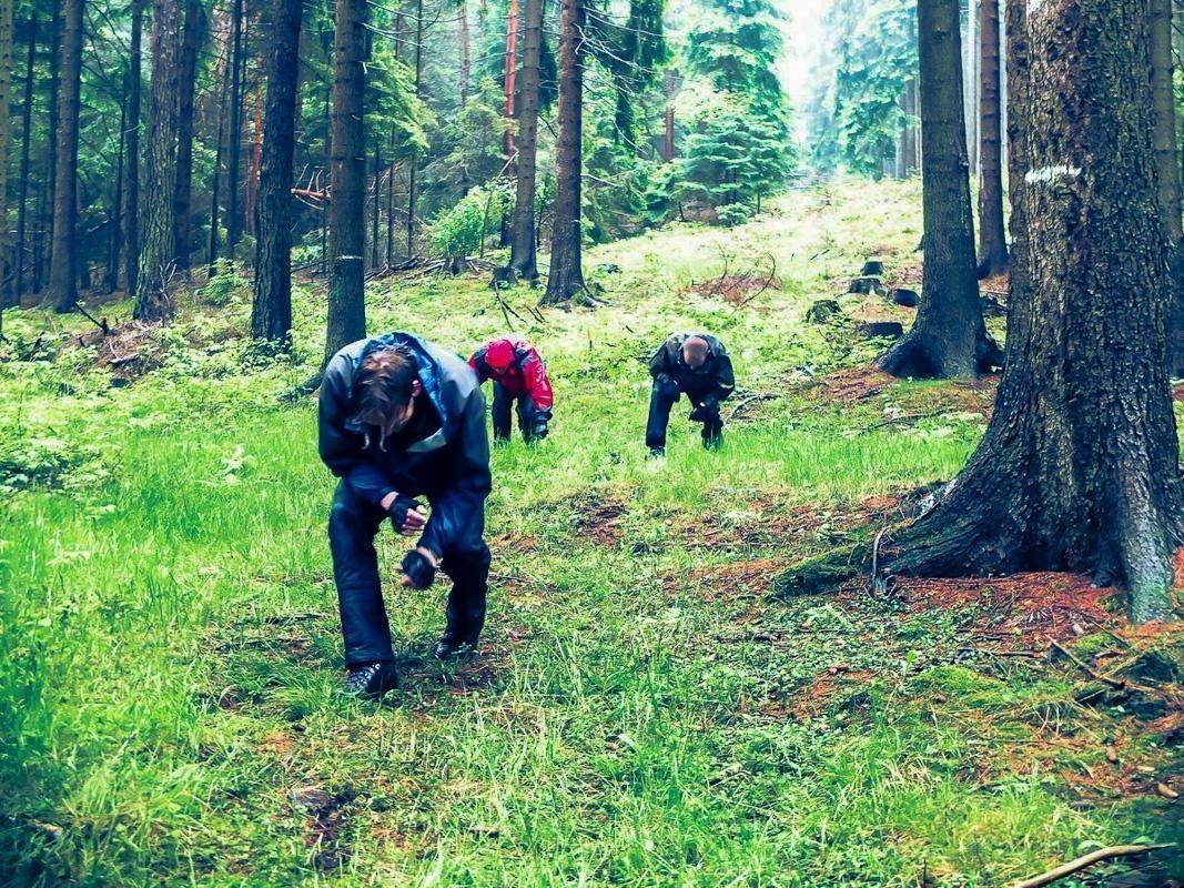 Drei Personen beugen sich über den Boden im Wald und betrachten etwas
